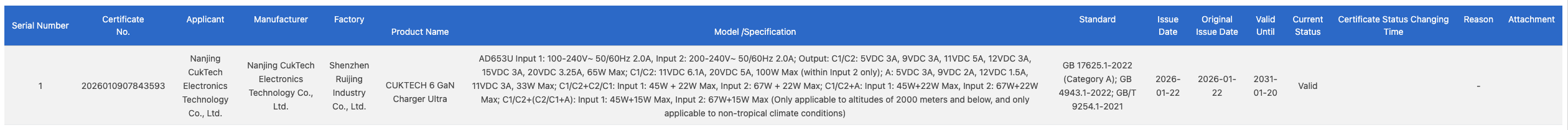 Le Cuktech 6 GaN Charger Ultra figure désormais dans la base de données du Centre chinois de certification de la qualité (CQC) ( ). L'entrée indique que cet accessoire inédit a obtenu la certification CCC (China Compulsory Certification) ou 3C. Cette page révèle également certaines des caractéristiques de ce produit.
