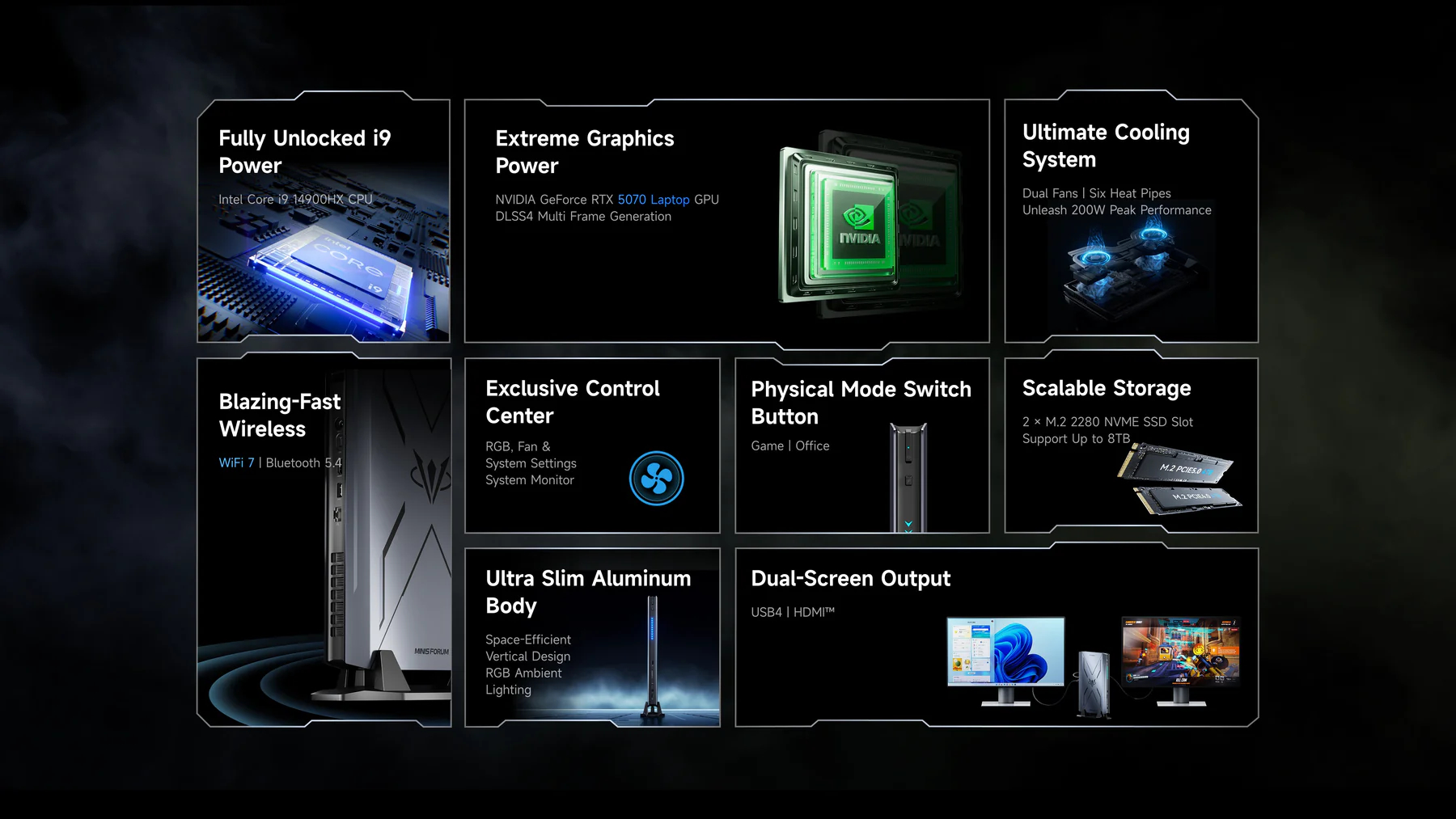 En outre, l'AtomMan G7 Pro ne peut être configuré qu'avec une carte d'extension Nvidia GeForce RTX 5070 que Minisforum refroidit avec six caloducs, deux ventilateurs et un système d'échappement à trois côtés. Apparemment, ce système de refroidissement permet à l'AtomMan G7 Pro de tirer jusqu'à 200 W pendant les tests de stress avec le mode jeu activé. Sinon, le mini-PC consommera jusqu'à 150 W en mode bureau.