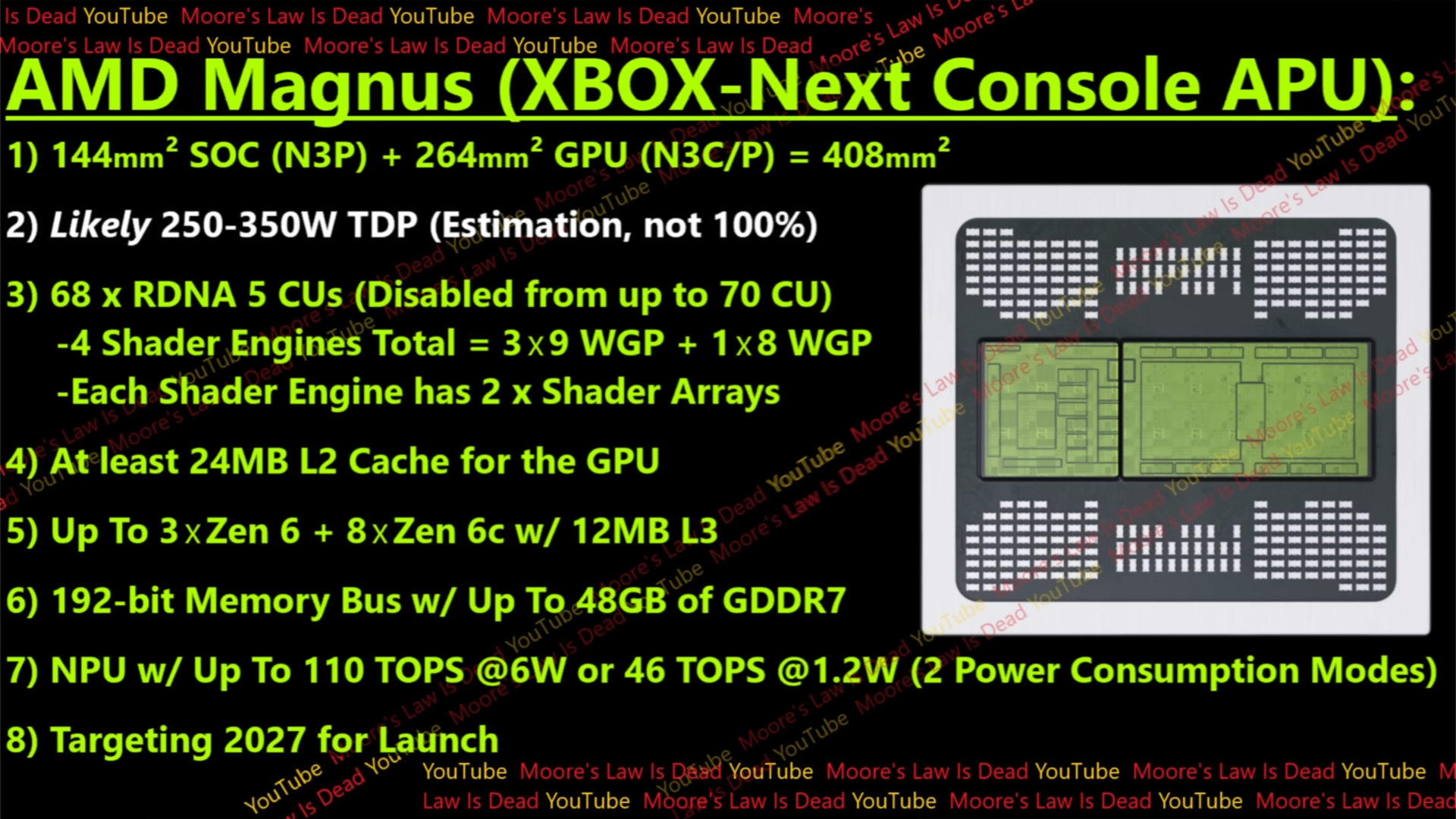 Son GPU sera fabriqué sur le nœud N3P ou N3C de TSMC, tandis que son SoC sera sur le nœud N3P de TSMC. Côté CPU, elle sera équipée d'un processeur à 11 cœurs avec trois cœurs Zen 6 et huit cœurs Zen 6c. Tom précise que ce chiffre est provisoire et que certains d'entre eux pourraient être désactivés. Enfin, la Xbox Magnus est également équipée d'un NPU pour les tâches d'intelligence artificielle sur l'appareil.