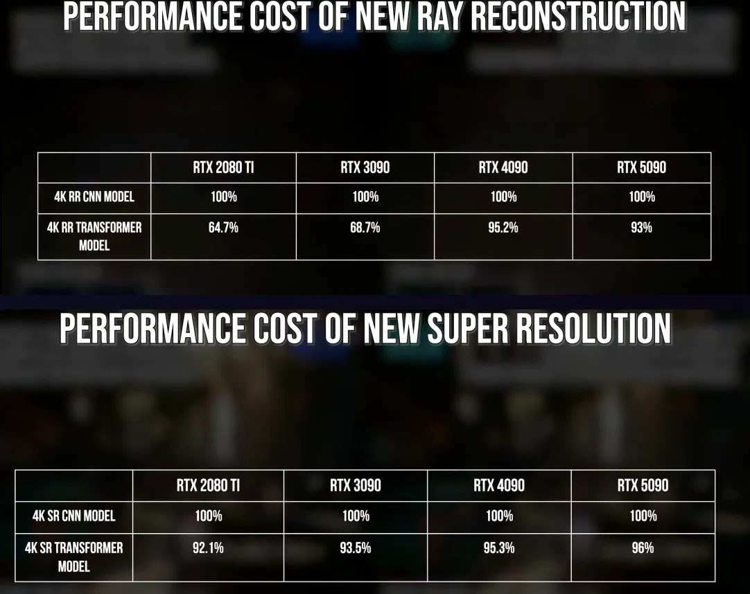 Le Transformer de DLSS 4 s'accompagne d'un certain surcoût en termes de performances. Comme l'indique Digital Foundry dans son site DLSS 4 deep diveles cartes Turing RTX 20 et Ampere RTX 30 sont fortement pénalisées par Transformer car leurs cœurs Tensor ne prennent en charge que l'inférence FP16 en mode natif.
