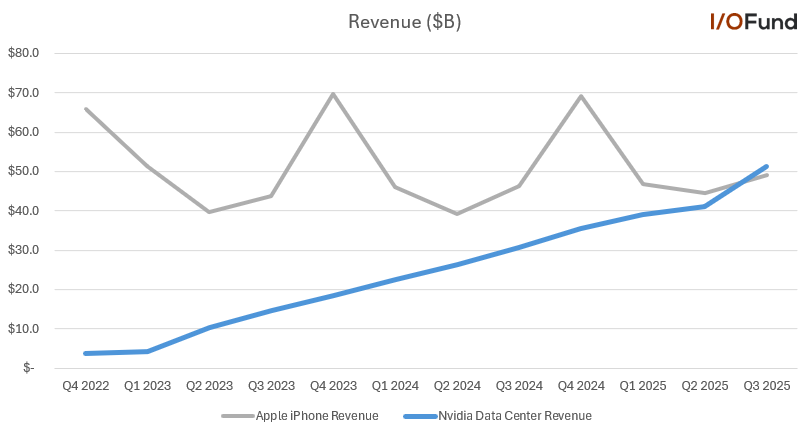 Selon les chiffres rapportés par I/O Fund (via Beth Kindig sur X), le chiffre d'affaires de Nvidia dans le domaine des centres de données pour le troisième trimestre 2025 a battu le chiffre d'affaires de l'iPhone de l'année précédente Applele chiffre d'affaires de l'iPhone pour la première fois.
