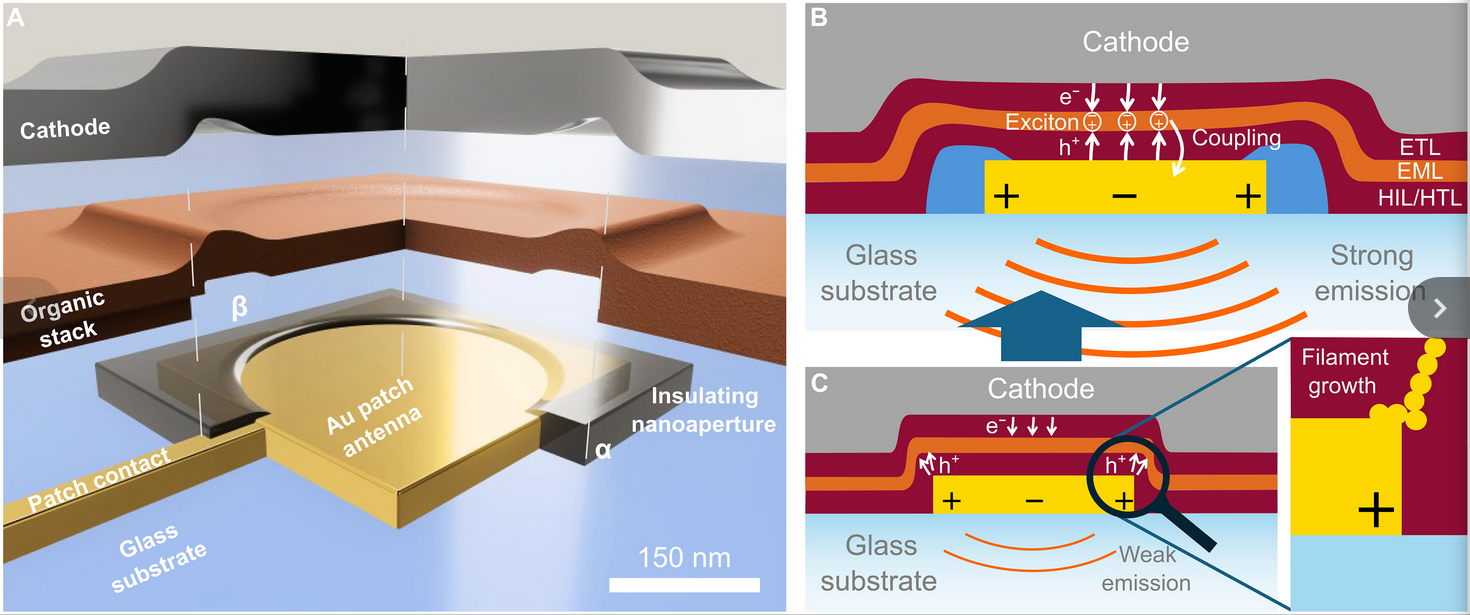 Les chercheurs allemands ont publié leurs résultats dans la revue Science Advances, où ils notent que le pixel de 300 nm² émet une lumière orange et est tout aussi lumineux qu'une OLED classique de 5 nm². Toutefois, la simple réduction de la diode électroluminescente ne permettrait pas d'obtenir une efficacité fiable. Les scientifiques ont dû mettre en œuvre une antenne cubique en or mesurant 300 x 300 x 50 nm et ont également dû s'assurer que les courants du champ électrique ne forcent pas les atomes d'or à se ramifier dans le matériau optiquement actif et à court-circuiter l'ensemble de la structure du pixel. Pour ce faire, les chercheurs ont conçu une couche isolante au-dessus de l'antenne, qui laisse une ouverture circulaire d'un diamètre de 200 nm au centre de l'antenne.