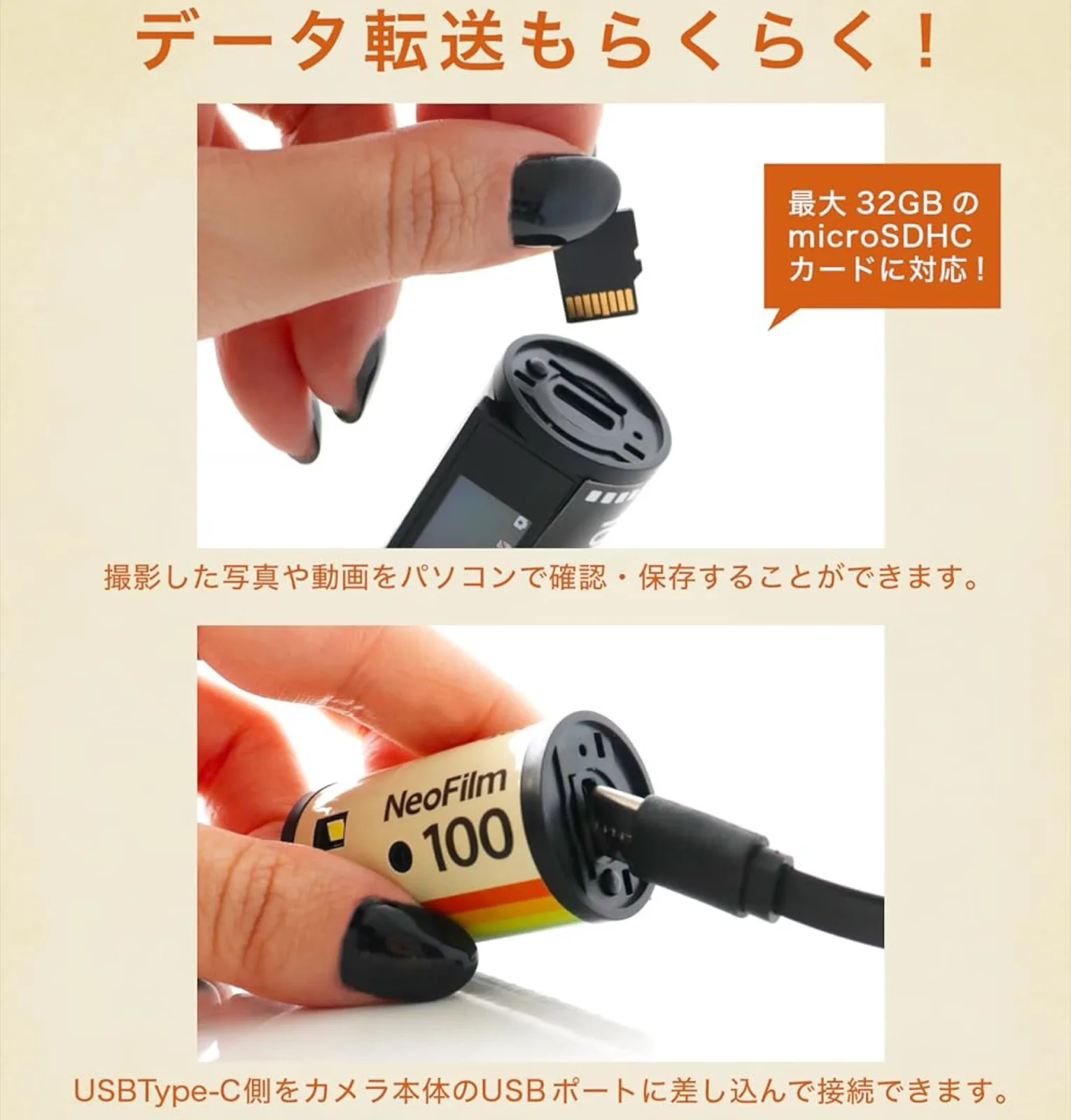 Le NeoFilm est disponible en trois couleurs différentes, toutes inspirées de films populaires. Au dos, un petit écran de 160 x 80 pixels permet de cadrer les photos. Il indique également l'état de la batterie et la carte microSD, qui peut être insérée dans le bas de l'appareil. L'avant de l'appareil abrite un minuscule objectif à peine visible doté d'un capteur CMOS de 8 mégapixels (1/4 de pouce).