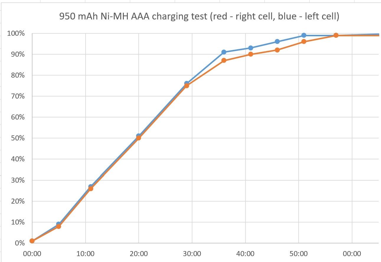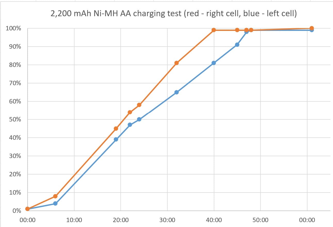 Le taux de charge des paires de piles AA était sensiblement inégal, une pile se chargeant plus rapidement que l'autre. Lors du chargement de paires, l'appareil n'éjecte pas l'élément qui s'est chargé en premier. Les piles chargées étaient légèrement chaudes au toucher.