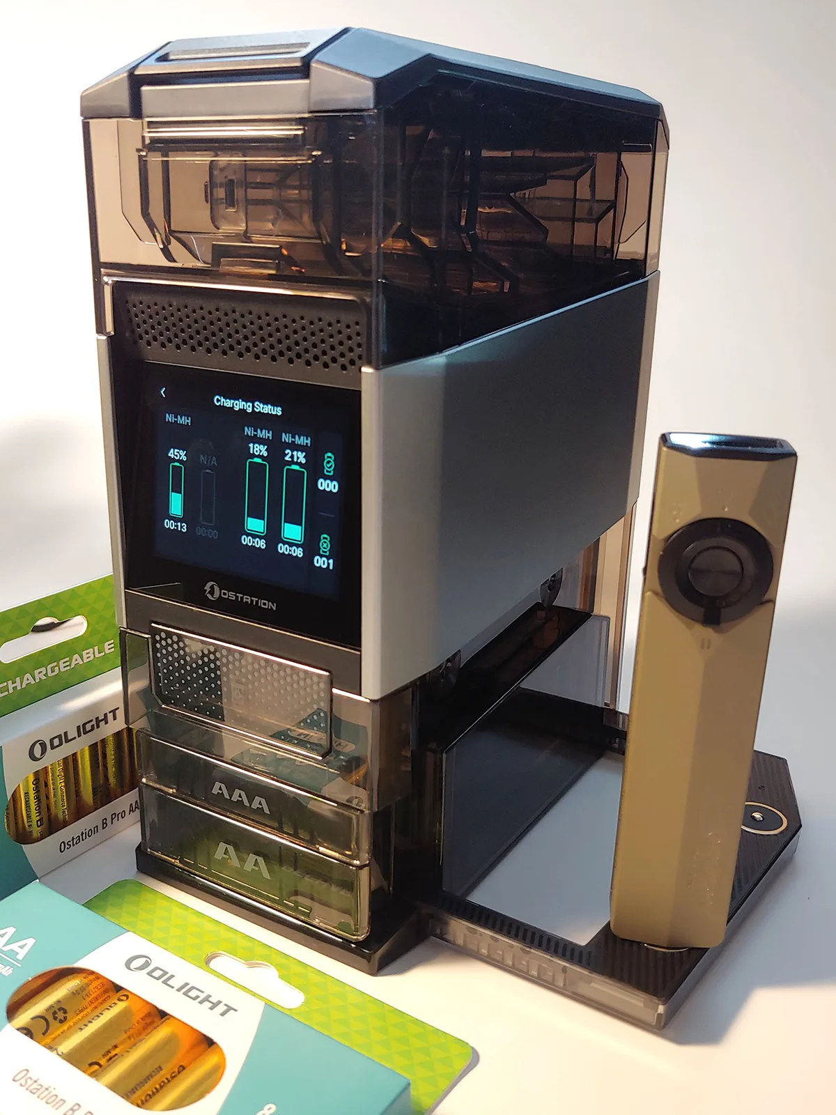 Un écran tactile couleur situé au-dessus des bacs permet de contrôler le chargeur. Sur la droite, un chargeur magnétique rabattable peut être utilisé pour recharger deux lampes de poche Olight. Le port d'alimentation USB-C se trouve à l'arrière.