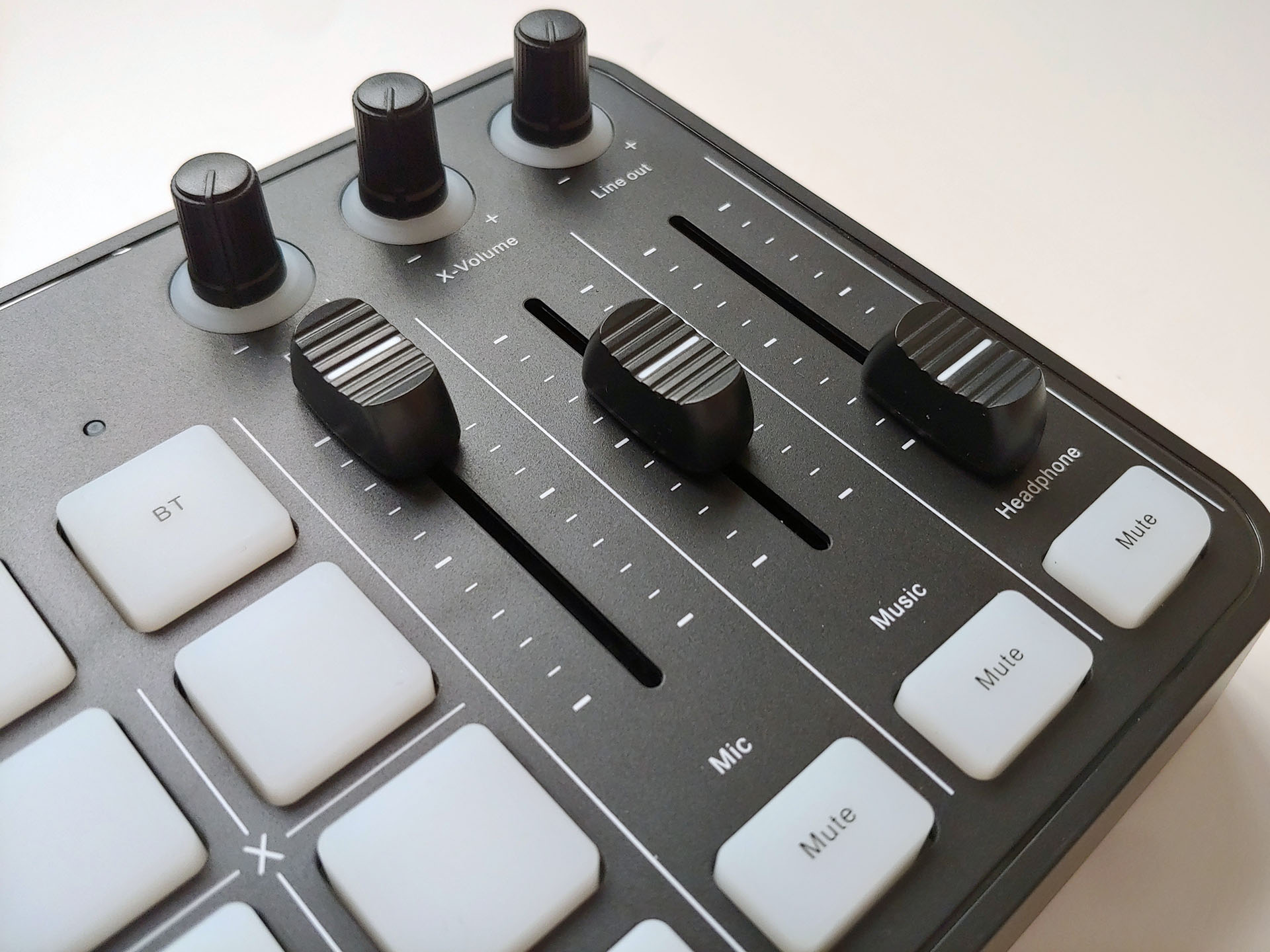 Les curseurs sont assez lisses, mais nécessitent un toucher plus stable que sur les tables de mixage professionnelles pour régler simultanément les trois curseurs d'une seule main. Le curseur du microphone ne contrôle que le volume des entrées combinées XLR et microphone du casque, de sorte que la seule façon d'équilibrer le volume de deux haut-parleurs est de déplacer les microphones.