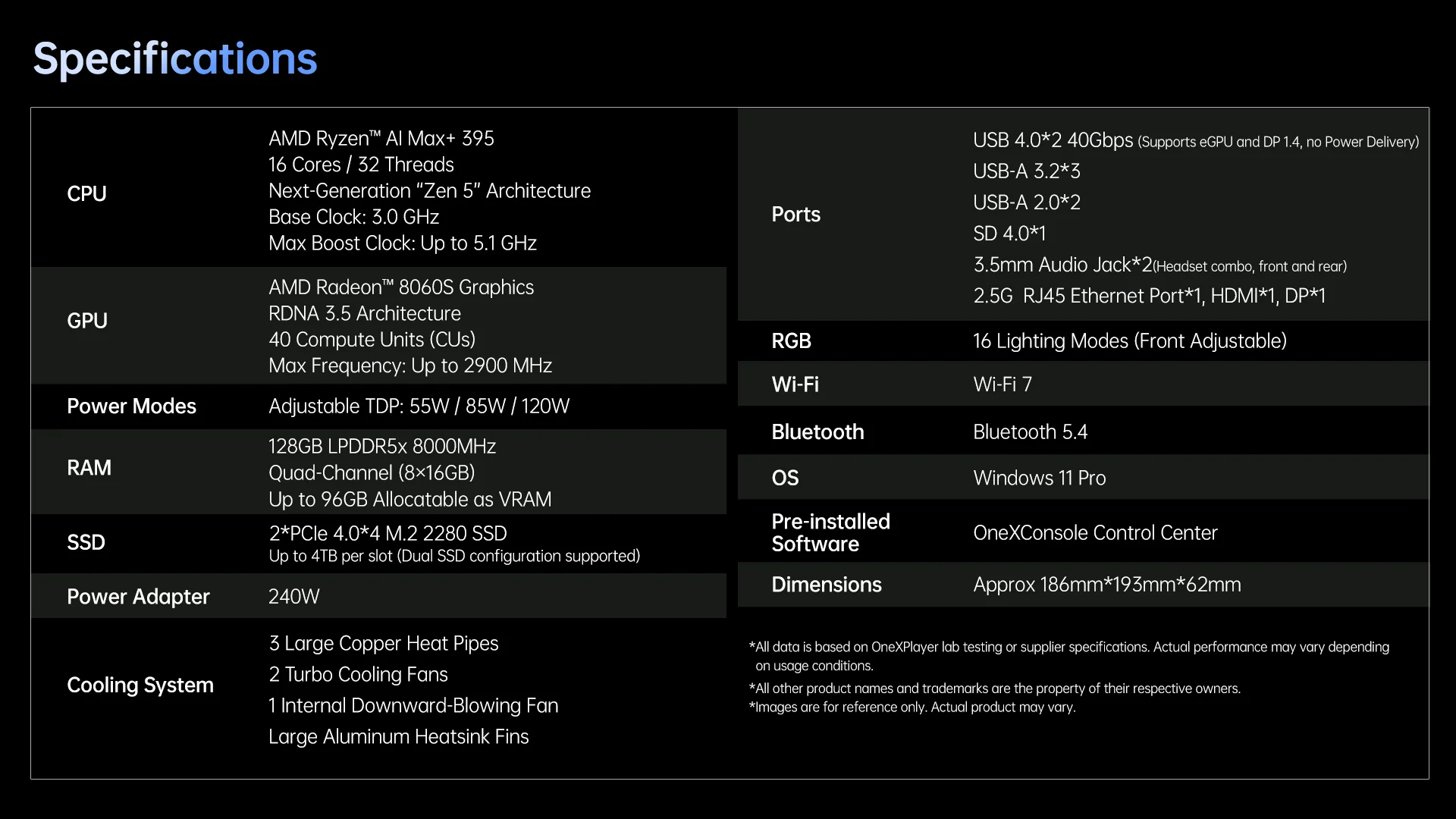 La OneXStation est disponible sur la boutique officielle à l'adresse au prix de lancement de 2 999 $. Ce prix correspond à la seule configuration proposée par OneXPlayer, qui comprend 128 Go de RAM et 1 To de stockage. Consultez la fiche technique ci-dessous pour en savoir plus sur le système.