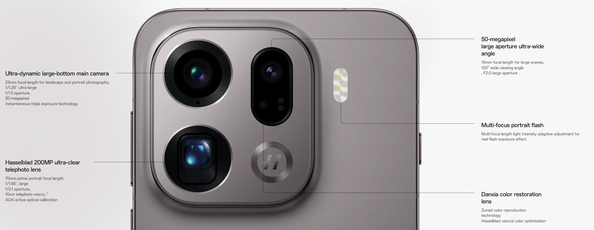 Outre la batterie géante de 7 500 mAh logée dans un boîtier fin de 8,25 mm, l'appareil photo à zoom téléobjectif doté d'un capteur Samsung de 200 MP est la caractéristique la plus remarquable de l'Oppo Find X9 Pro. Le téléobjectif Hasselblad de 200 MP a été co-développé en termes d'étalonnage du capteur et de conception optique pour s'adapter au nouveau système Hasselblad Master Camera System alimenté par le nouveau moteur d'image Lumo d'Oppo qui contrôle le matériel et les fonctionnalités de l'appareil photo du Find X9 Pro :
