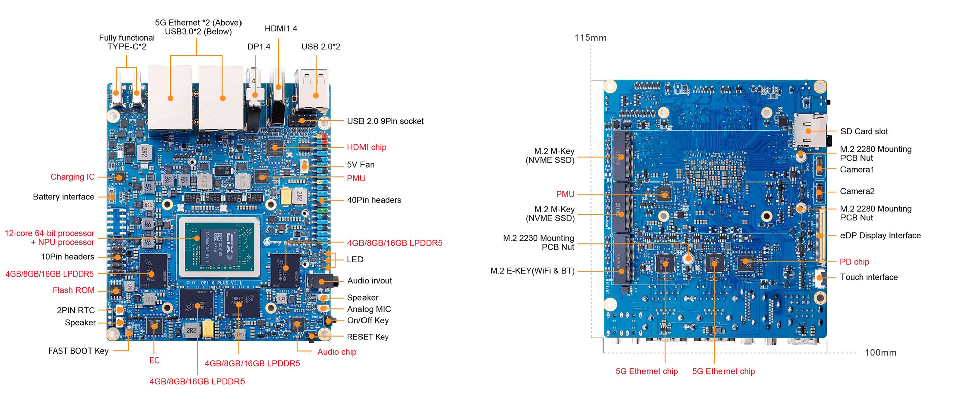 L'Orange Pi 6 Plus est équipé d'un SoC à douze cœurs et, selon la configuration, la mémoire LPDDR5 a une capacité de 16, 32 ou 64 Go. Plusieurs emplacements M.2 2280 pour SSD sont disponibles, mais les utilisateurs peuvent également installer une carte M.2 Key E pour le WiFi et le Bluetooth. Comme d'habitude, cet ordinateur monocarte dispose également d'un lecteur de carte SD.