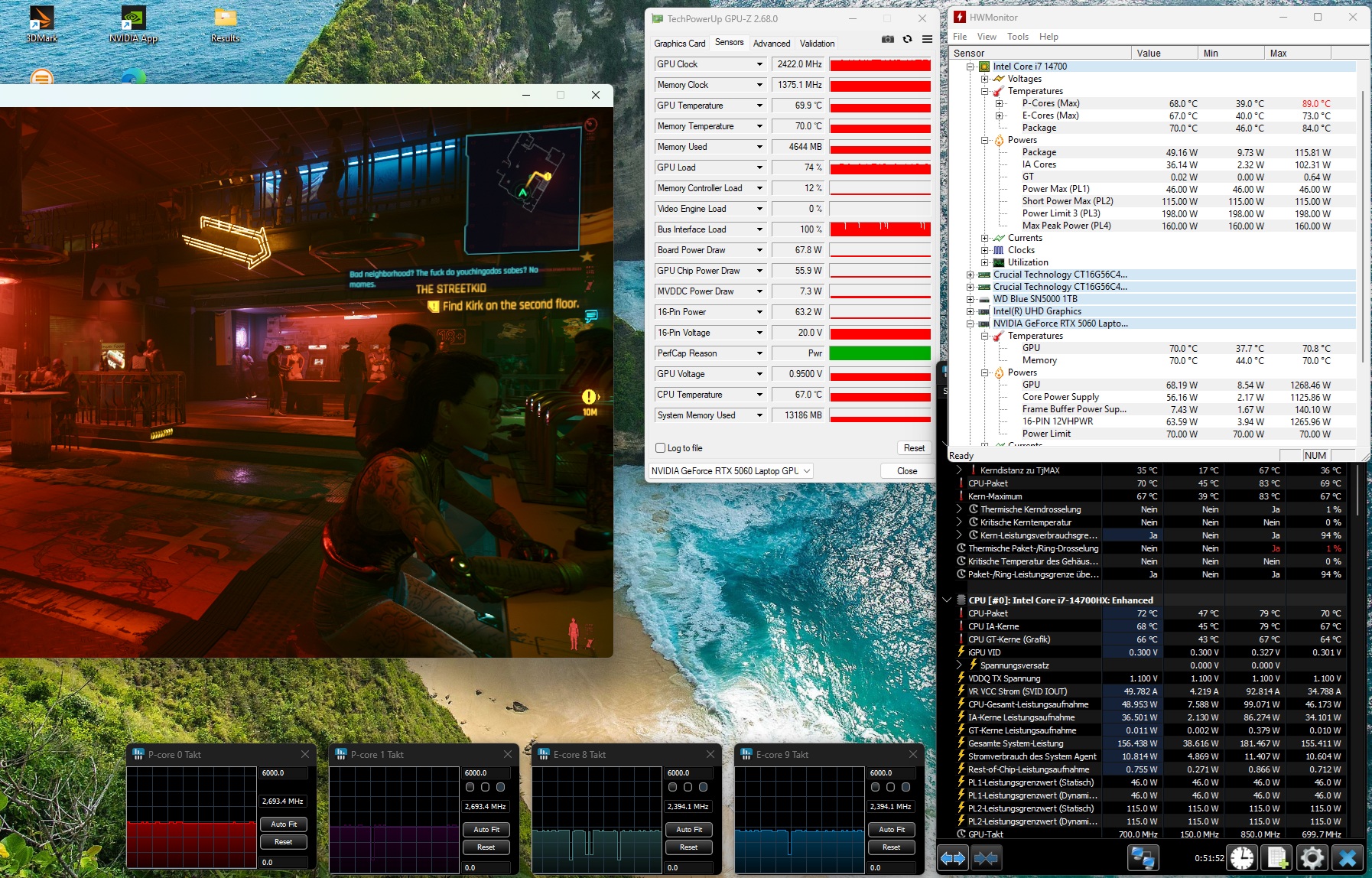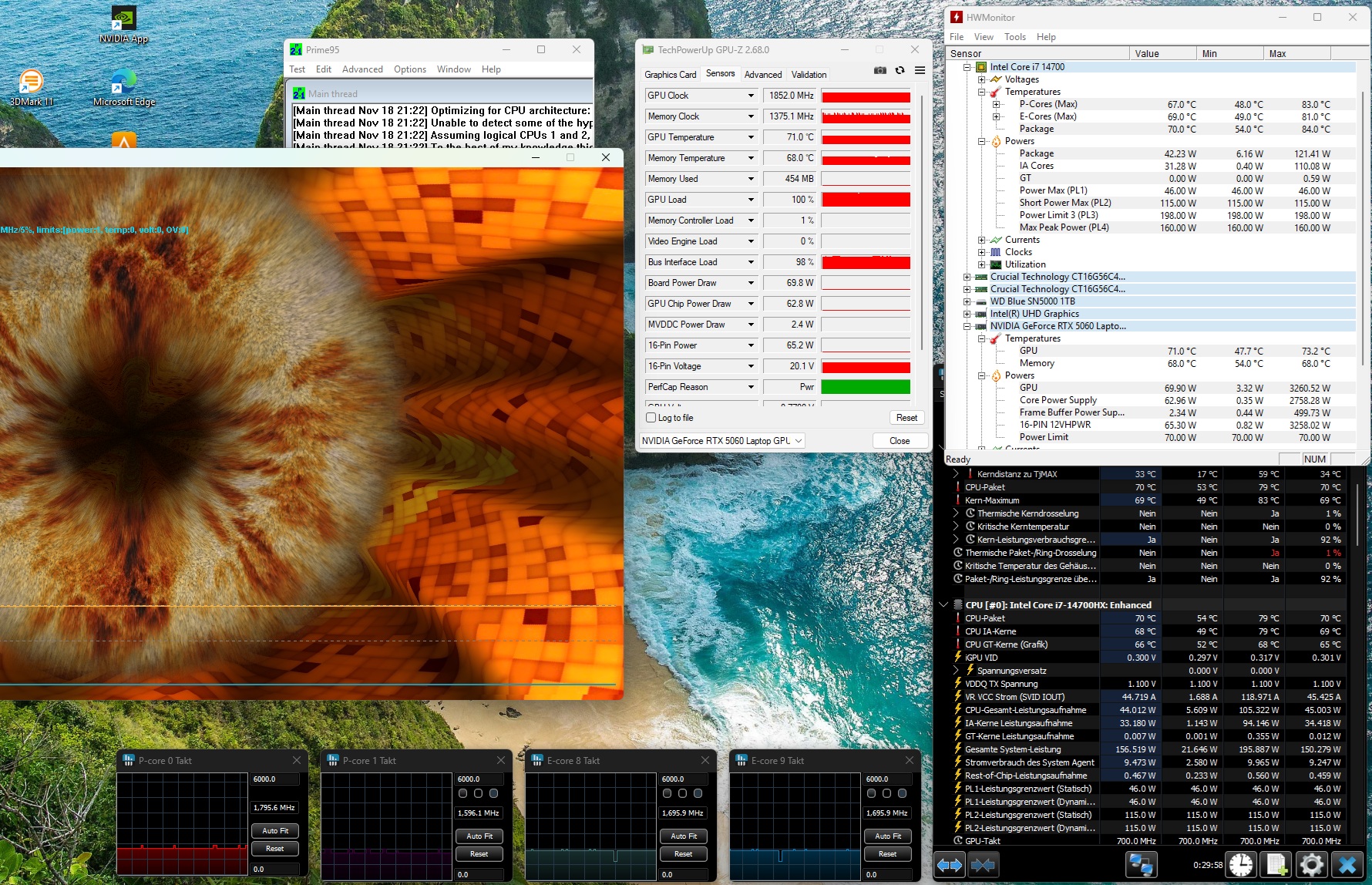 Le Core i7-14700HX a terminé le test de stress combiné Furmark et Prime95 à environ 70 °C, ce qui est tout à fait inoffensif. La RTX 5060 de GeForce s'est également stabilisée à environ 70 °C.