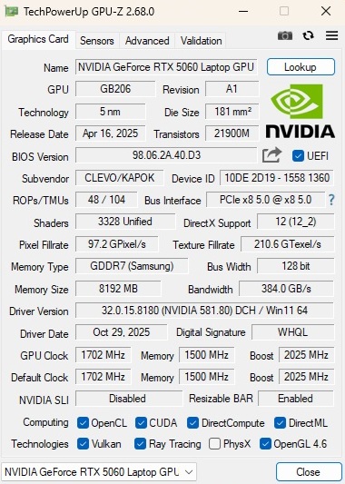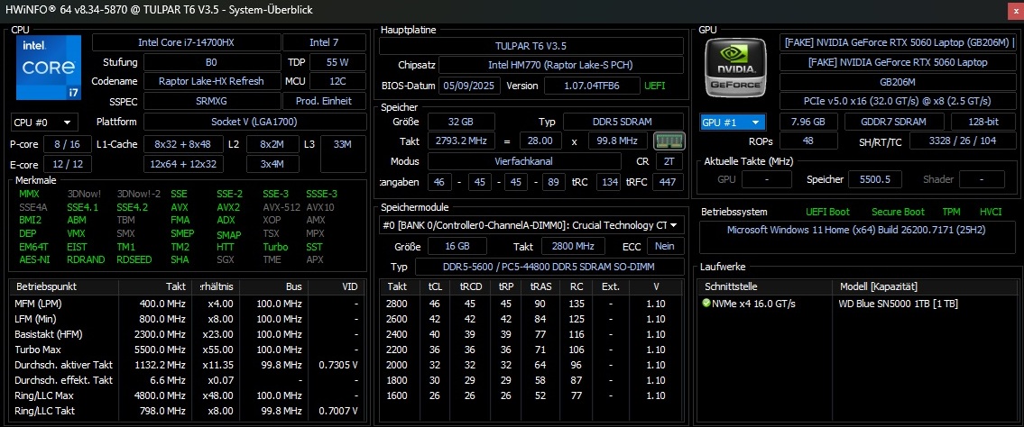 | Tulpar T6 V3.5 Intel Core i7-14700HX ⎘ NVIDIA GeForce RTX 5060 Laptop ⎘ 32 Go Mémoire, 1000 Go SSD | Prix de liste: 1160 EUR | 2.4 kg | 25 mm | 16.00" 1920x1200 142 PPI IPS | |