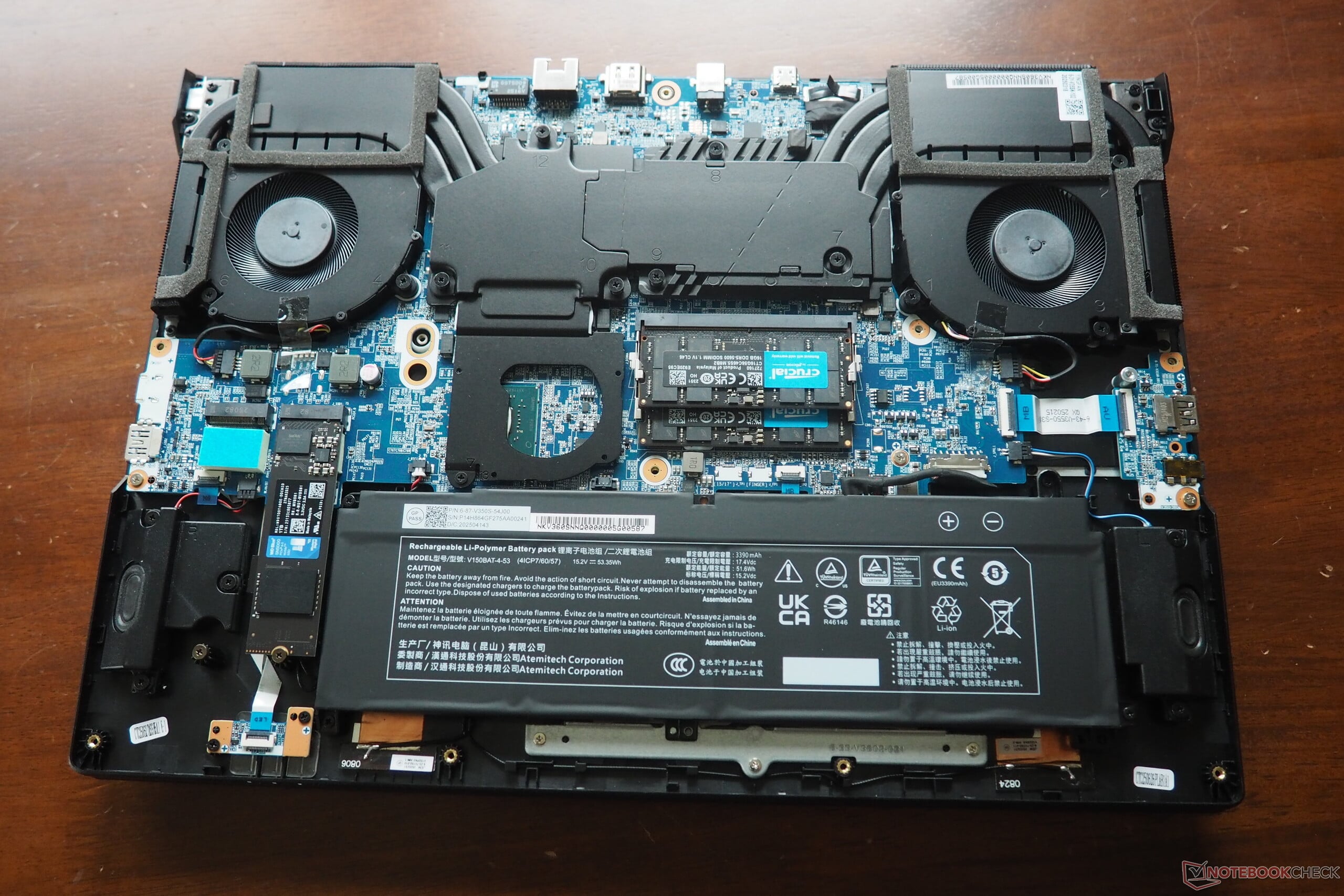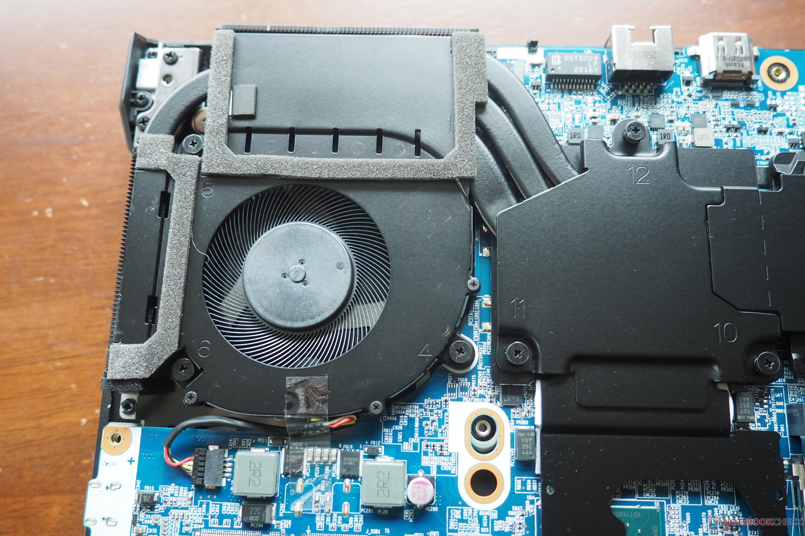 Au total, douze vis Phillips doivent être retirées avant que vous puissiez extraire le couvercle inférieur de ses supports. Sous le capot, vous trouverez un système de refroidissement avec deux ventilateurs, ainsi que deux emplacements pour la mémoire vive et deux emplacements pour les disques durs. La batterie est également accessible à partir d'ici.