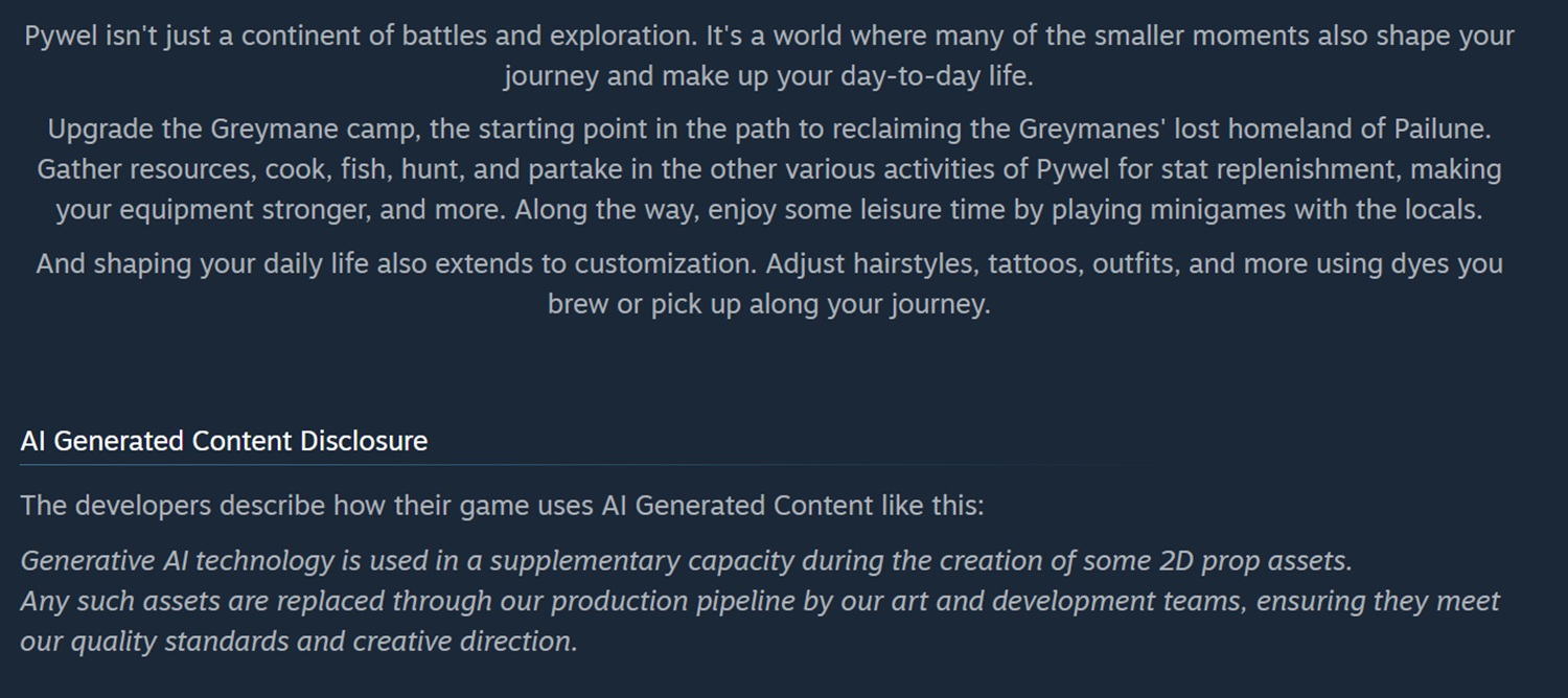 La page Steam de Crimson Desert affiche désormais une clause de non-responsabilité, comme l'exige Valve. On peut y lire : "La technologie d'IA générative est utilisée à titre complémentaire lors de la création de certains accessoires 2D." Comme pour la publication sur les réseaux sociaux, Pearl Abyss explique que ces images provisoires ne doivent être que temporaires.