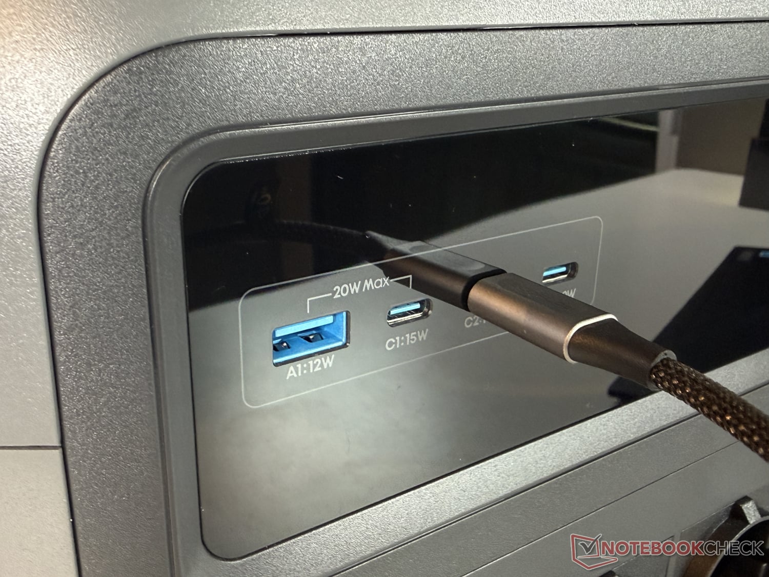 Une fois de plus, cinq prises de courant alternatif (ce qui est beaucoup pour une centrale de 1 kWh), une prise de voiture de 12 V et quatre ports USB sont disponibles en tant que connexions. Anker Solix s'appuie désormais sur trois ports USB-C et un port USB-A (contre deux pour la première génération) et a également augmenté la puissance maximale via USB-C jusqu'à 140 W (au lieu de 100 W). Hormis la prise 12 V sur le côté, aucun des ports n'est protégé par un cache.