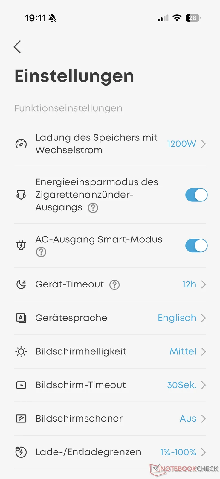L'application fournit également des informations telles que le niveau de charge de la batterie et le temps d'utilisation restant à la puissance de sortie actuelle, ainsi que la température des cellules de la batterie. Divers réglages peuvent être effectués dans le menu pour la vitesse de charge maximale, l'économie d'énergie, les limites de charge et de décharge et tous les aspects de l'affichage. Il est également possible de mettre à jour le micrologiciel.