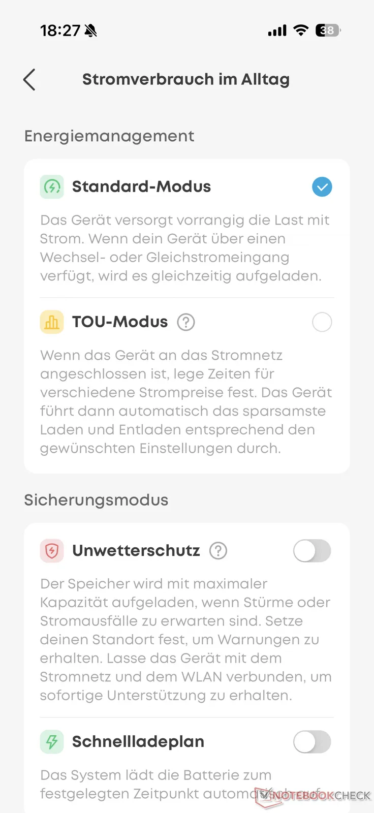 L'établissement de la connexion a fonctionné sans problème lors du test, de sorte que l'installation s'est faite en un rien de temps. L'application Anker permet non seulement d'activer et de désactiver les différentes connexions et l'écran, mais aussi de sélectionner différents modes. En mode TOU, par exemple, la centrale peut être chargée automatiquement aux heures creuses les plus favorables. Dans ce cas, il est seulement possible de mémoriser différentes heures et il n'y a pas de lien direct avec les tarifs dynamiques de l'électricité (comme avec les centrales électriques à balcon d'Anker Solo) Centrales à balcon d'Anker Solix).