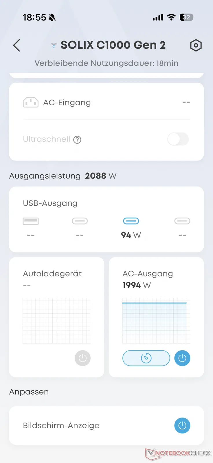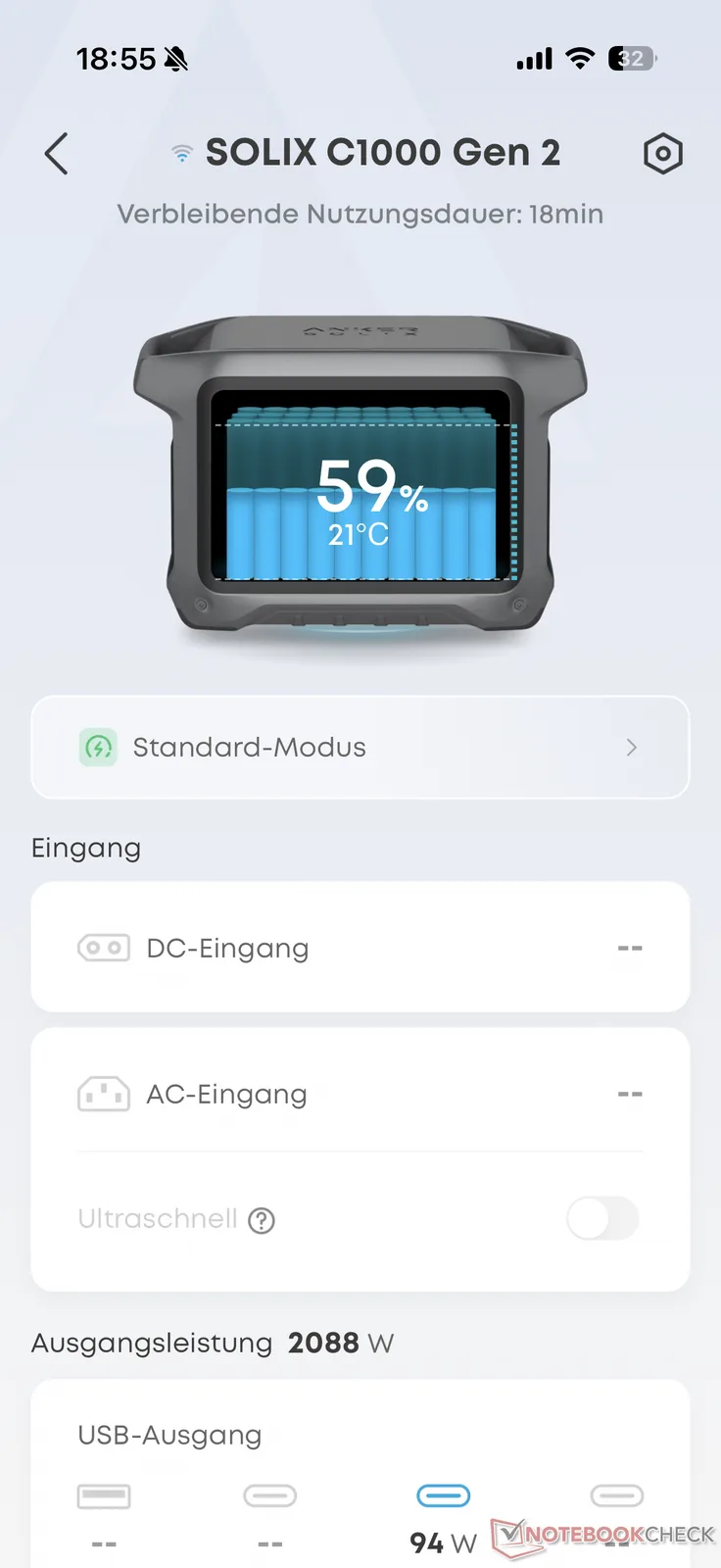 Notre court test pratique n'a pas permis de déterminer avec certitude si cela est bénéfique à long terme pour les cellules de la batterie. Anker Solix promet 4 000 cycles de charge ou 10 ans de performance. Cependant, nous pouvons affirmer avec certitude que 1 110 Wh ont traversé l'appareil de mesure lors d'un processus de charge en courant alternatif, conformément à la mesure (version UE). Avec une capacité déclarée de 1 024 Wh, cela donne un rendement d'environ 92 %, ce qui est une bonne valeur.
