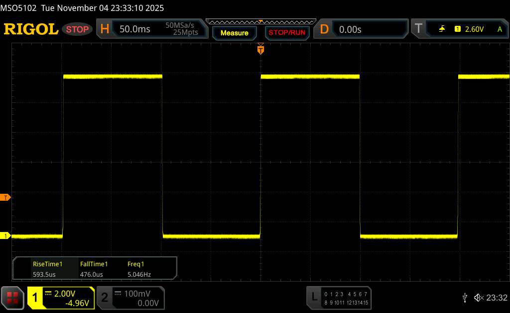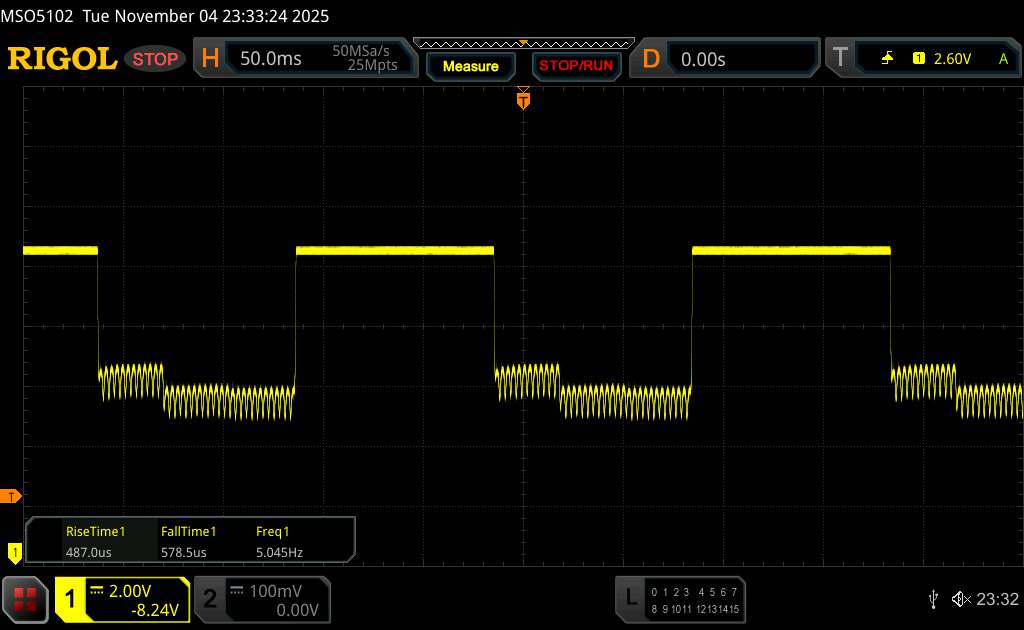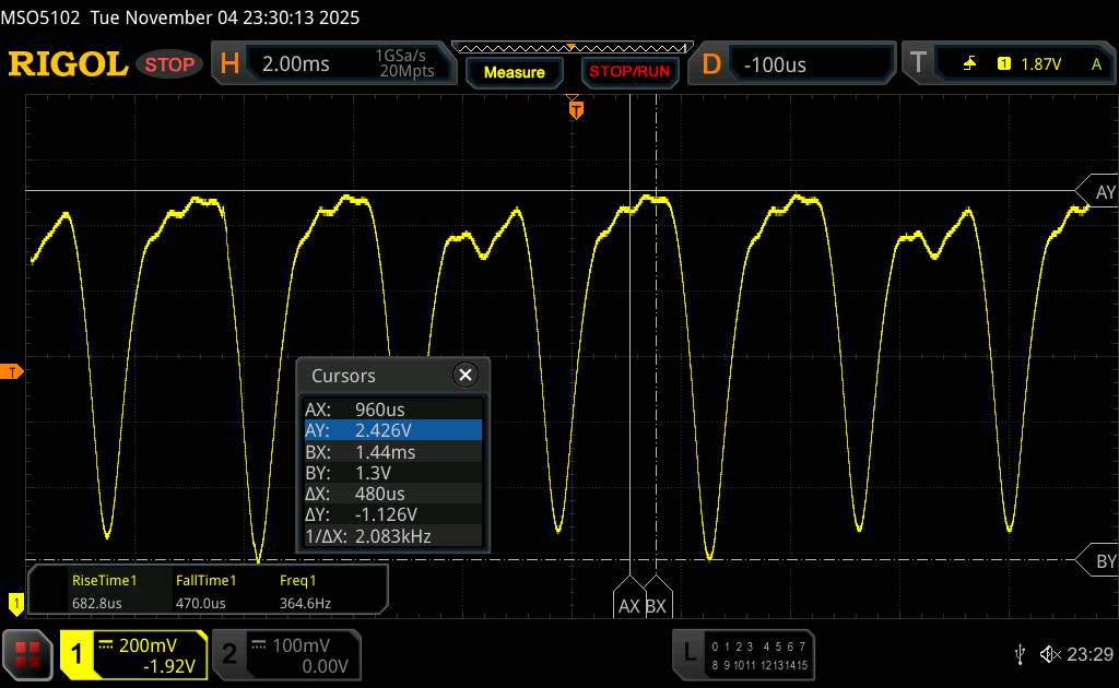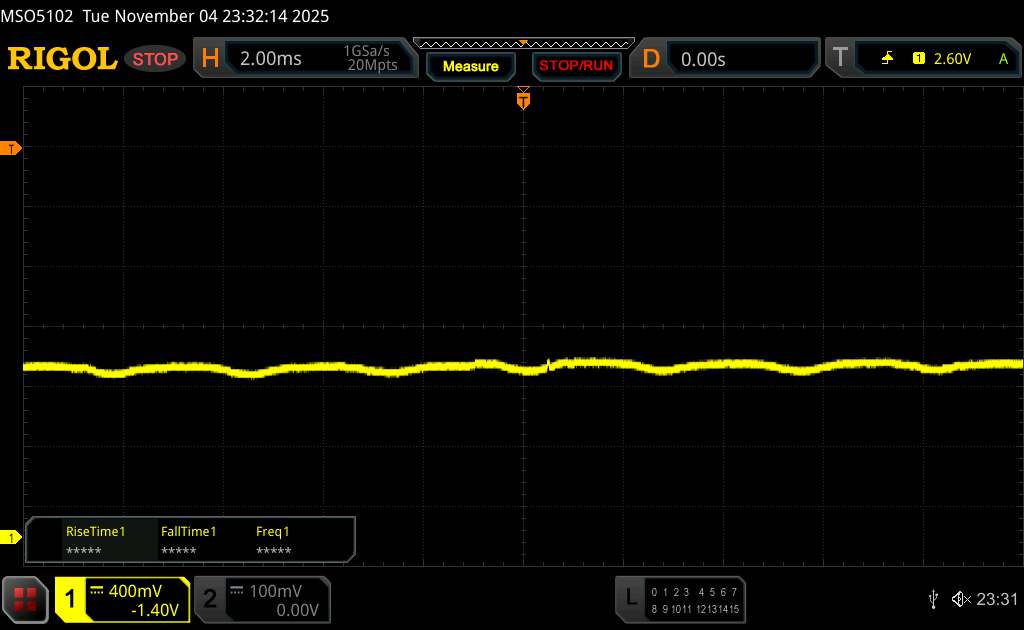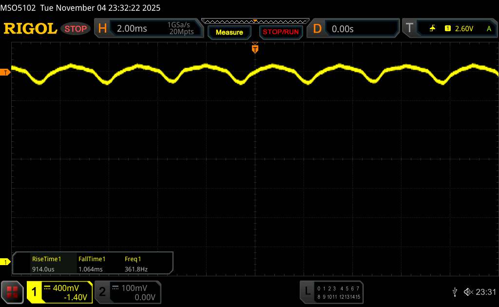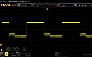 À l'aide d'un oscilloscope, nous avons mesuré un scintillement de base d'environ 360 Hz. En outre, Vivo utilise une gradation PWM haute fréquence à une fréquence de 2 083 Hz lorsque la luminosité de l'écran du téléphone est réglée au minimum. Ceci, ainsi que la courbe d'amplitude plate, devrait permettre d'éviter tout inconfort pour la plupart des gens, mais cela ne peut pas être complètement exclu pour les personnes sensibles.