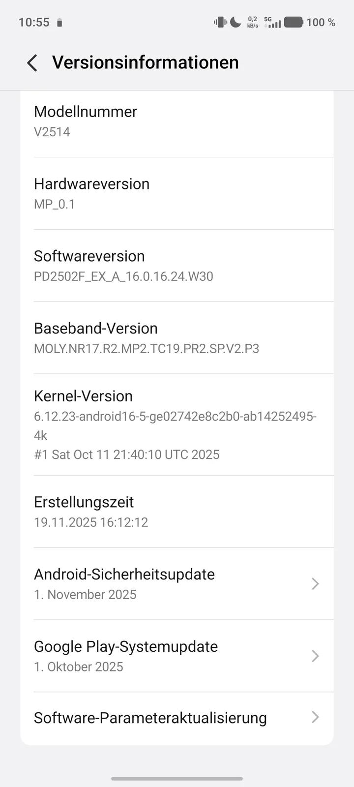 Le Vivo X300 Pro est livré avec Google Android 16 et sa propre interface utilisateur OriginOS 6. Au moment du test, les correctifs de sécurité étaient à jour et ils devraient être distribués pendant sept ans (à partir du lancement sur le marché). Toutefois, Vivo n'a fourni aucune information sur la fréquence des mises à jour. Les principales mises à jour de Android devraient être fournies pendant cinq ans.