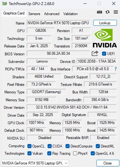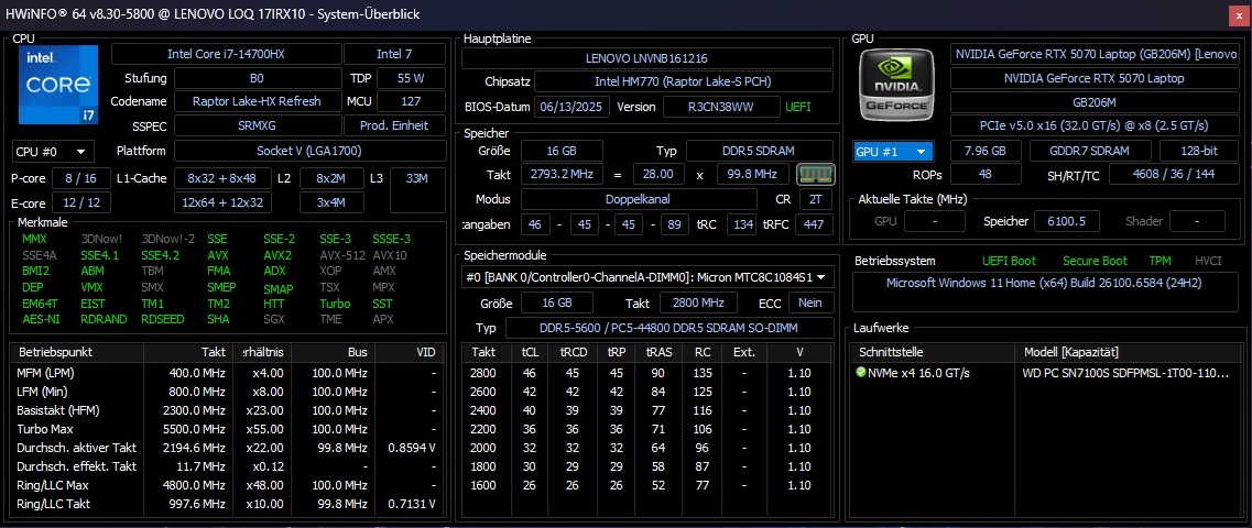 En conséquence, les attentes ne sont pas aussi élevées que celles de certains concurrents, mais Lenovo - avec une ou deux critiques - réussit à faire un travail décent. Les bonnes performances de la carte graphique méritent d'être soulignées. Grâce à l'overclocking intégré du GPU, la RTX 5070 offre des performances supérieures à la moyenne. Parmi les points positifs, citons les deux emplacements de RAM et de SSD pour de futures mises à niveau, les périphériques d'entrée relativement bons et les surfaces résistantes à la saleté.