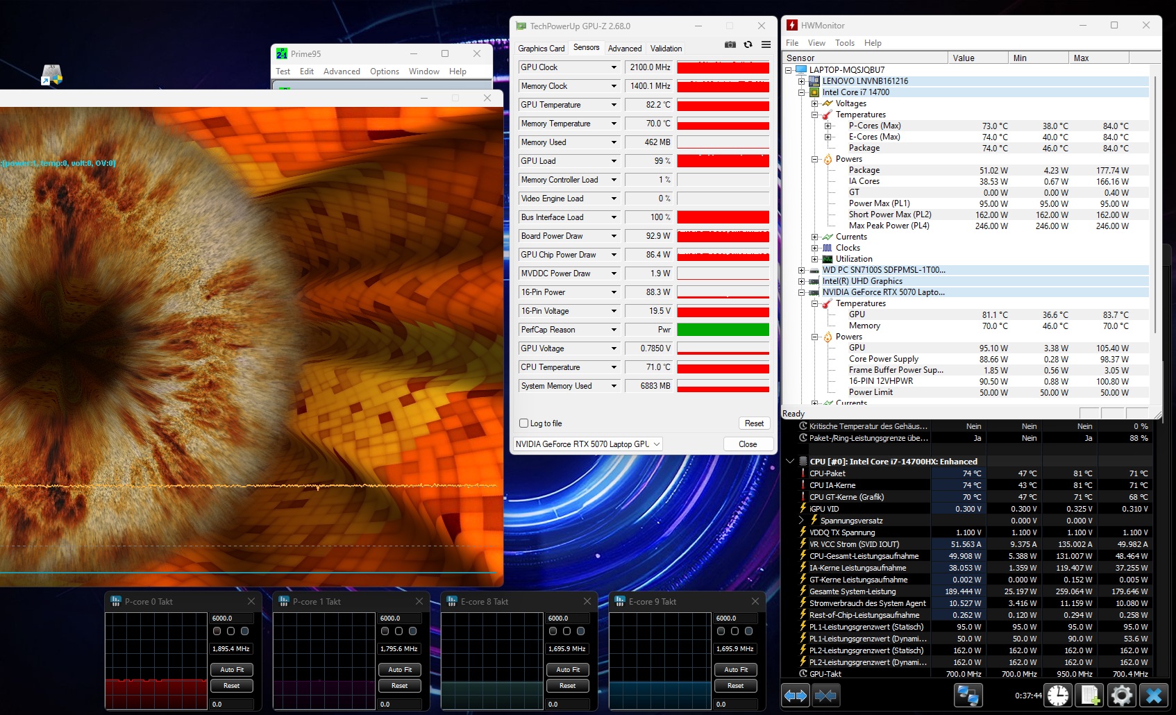 Lors du test de stress effectué à l'aide des outils Furmark et Prime95, le processeur a chauffé jusqu'à environ 74 °C, une valeur modérée, tandis que la carte graphique a chauffé jusqu'à environ 82 °C.