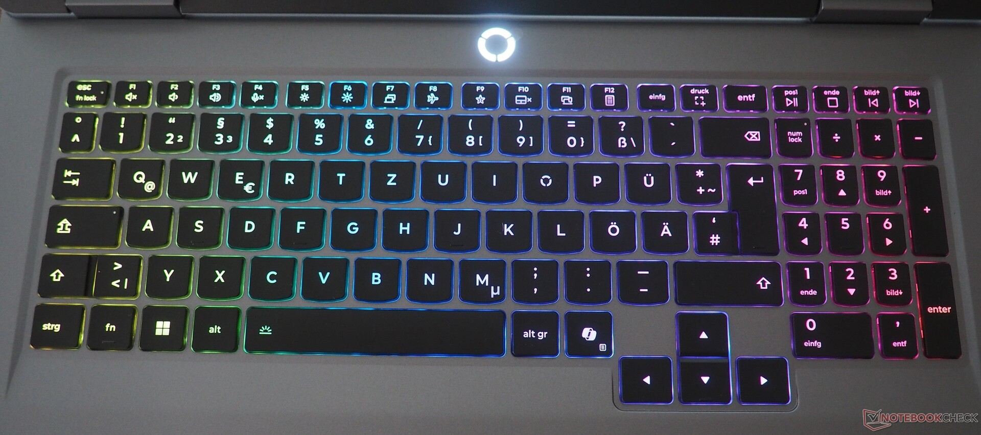Même si le clavier n'atteint pas les performances des claviers mécaniques, l'expérience de frappe est globalement solide. La disposition bien conçue mérite des éloges particuliers, ce qui n'est pas toujours le cas, en particulier dans le segment des jeux. De nombreux concurrents pourraient également s'inspirer des touches fléchées de taille raisonnable. Elles sont complétées par un pavé numérique de taille normale, dont les touches (malgré l'espace disponible) sont un peu plus étroites que celles du clavier principal. Le rétroéclairage intégré n'est pas aussi intense que celui d'autres claviers Lenovo pour le jeu, comme le Legion 9 18, mais il peut être réglé sur plusieurs niveaux.