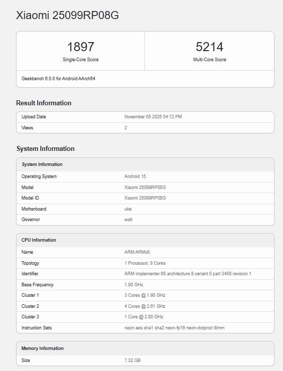 Comme le montre Geekbench, cette nouvelle tablette porte le numéro de modèle "25099RP08G" et devrait, selon les rumeurs, être commercialisée sous le nom de Poco Pad X1. La rumeur de cette tablette a fait surface pour la première fois il y a deux mois, avec la rumeur qu'il s'agissait d'un rebadge du Xiaomi Pad 7. Le listing Geekbench semble corroborer cette hypothèse, puisqu'il montre l'appareil avec l'Adreno 732 - le GPU du Xiaomi Pad 7 - et le Snapdragon 7+ Gen 3 Snapdragon 7+ Gen 3 qui équipait également le Xiaomi Pad 7.