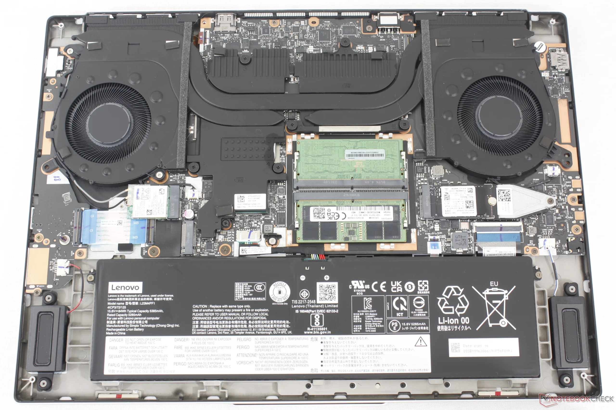 La raison en est la solution de refroidissement relativement faible. Lors de charges de travail combinées, le CPU et le GPU ne peuvent consommer que 80 watts au total, ce qui n'est pas un bon résultat si l'on considère le grand châssis de 16 pouces. A titre de comparaison : L'ordinateur portable de jeu Lenovo Legion 7 16qui combine un processeur beaucoup plus rapide avec la version 115W de la GeForce RTX 5060 peut gérer jusqu'à 145 Watts, soit presque le double de la valeur du ThinkPad P16v Gen 3, beaucoup plus cher. Nous ne voulons pas cacher le fait que le Legion est également beaucoup plus bruyant sous charge, mais l'écart de performance est encore assez significatif.