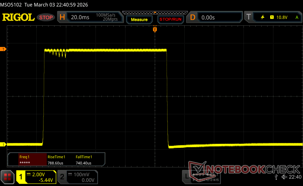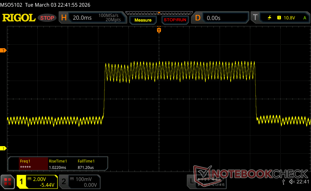 MSI utilise un écran tactile OLED de Samsung (1 920 x 1 200 pixels, 16:10). L'impression subjective de l'image est globalement bonne (noirs profonds, couleurs vives, temps de réponse rapides), mais la fréquence n'est que de 60 Hz, et les zones lumineuses apparaissent légèrement granuleuses. Le scintillement PWM est également présent à 480 Hz, mais l'amplitude est relativement faible.