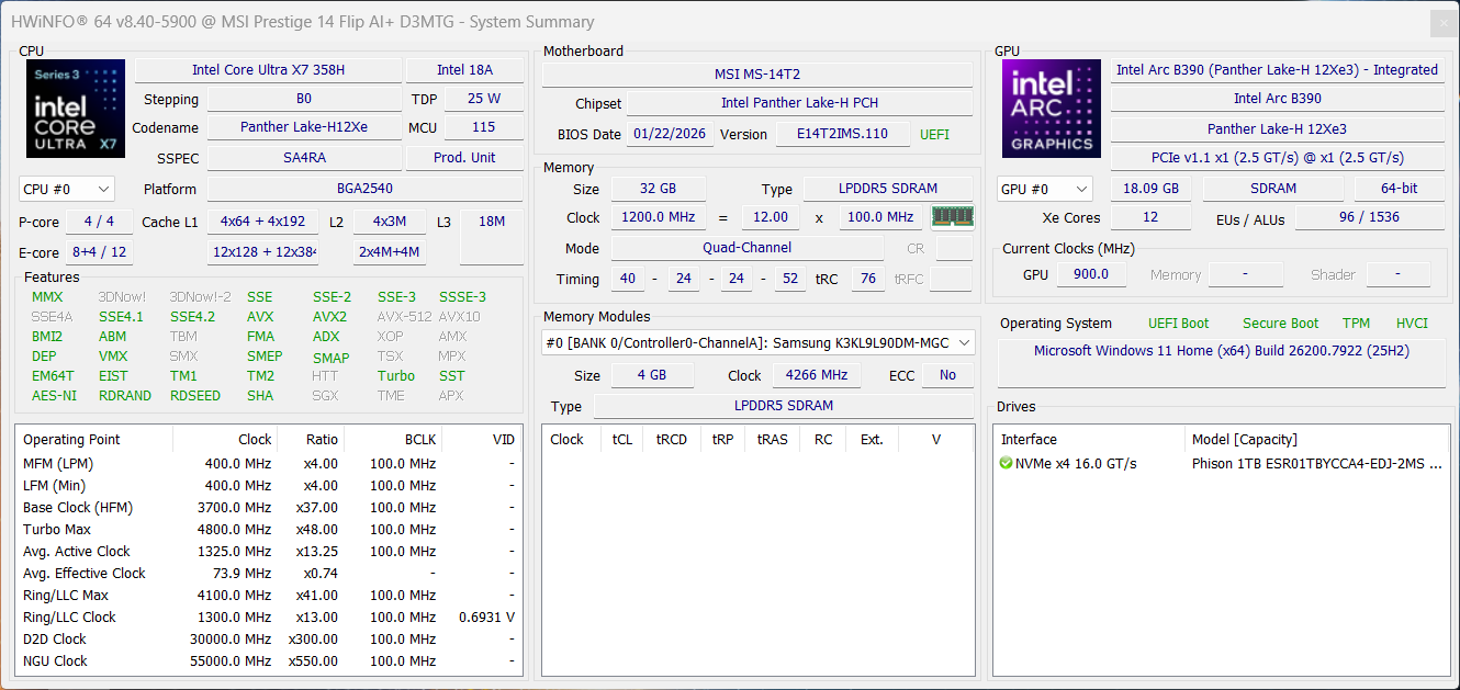 | MSI Prestige 14 Flip AI+ 2026 Intel Core Ultra X7 358H ⎘ Intel Arc B390 12 Xe3 Panther Lake iGPU ⎘ 32 Go Mémoire, 1000 Go SSD | Amazon: 1. $1,649.00 msi Prestige 14 AI Evo C1MG-... 2. $1,385.00 MSI Prestige 13 AI+ Evo (202... 3. $749.99 MSI Summit E13 Flip Evo (202... Prix de liste: 1549€ | 1.4 kg | 13.9 mm | 14.00" 1920x1200 162 PPI OLED | |