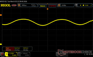 Le rétroéclairage de l'écran scintille à la fréquence de 480 Hz (certainement du fait de l'utilisation d'une MDI - Modulation de largeur d'impulsion) à un niveau de luminosité inférieur ou égal à 100 % . Aucun scintillement ne devrait être perceptible au-dessus de cette valeur. La fréquence de rafraîchissement de 480 Hz est relativement élevée, la grande majorité des utilisateurs ne devrait pas percevLa fréquence de rafraîchissement de 480 Hz est relativement élevée, la grande majorité des utilisateurs ne devrait pas percevoir de scintillements et être sujette à une fatigue oculaire accrue.oir de scintillements et être sujette à une fatigue oculaire accrue. Néanmoins certaines personnes pourront toujours percevoir un scintillement. En comparaison, 53 % des appareils testés n'emploient pas MDI pour assombrir leur écran. Nous avons relevé une moyenne à 7996 (minimum : 5 - maximum : 343500) Hz dans le cas où une MDI était active. | |||