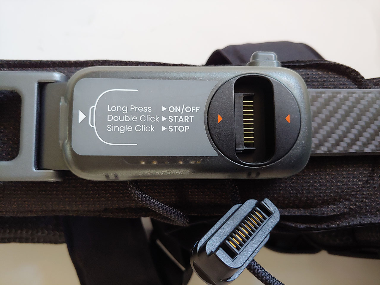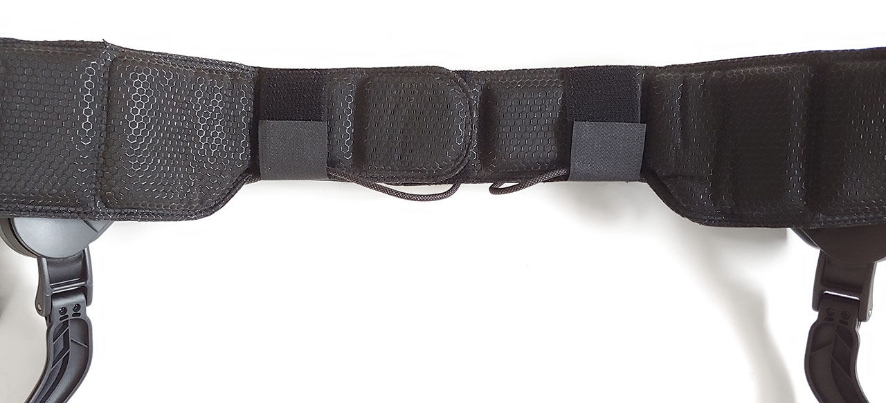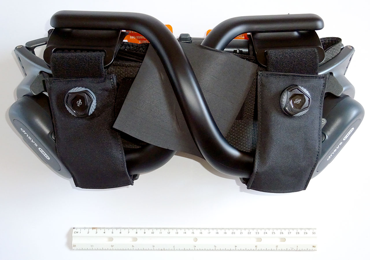 Les deux mains sont nécessaires pour enfiler la ceinture, qui doit être ajustée pour placer les moteurs sur les crêtes iliaques des hanches. Le velcro exposé à l'arrière de la ceinture peut provoquer des irritations, c'est pourquoi il est préférable de porter une chemise. La tension des sangles de jambe doit ensuite être équilibrée, car un mauvais ajustement crée un déséquilibre dans la transmission de la puissance.
