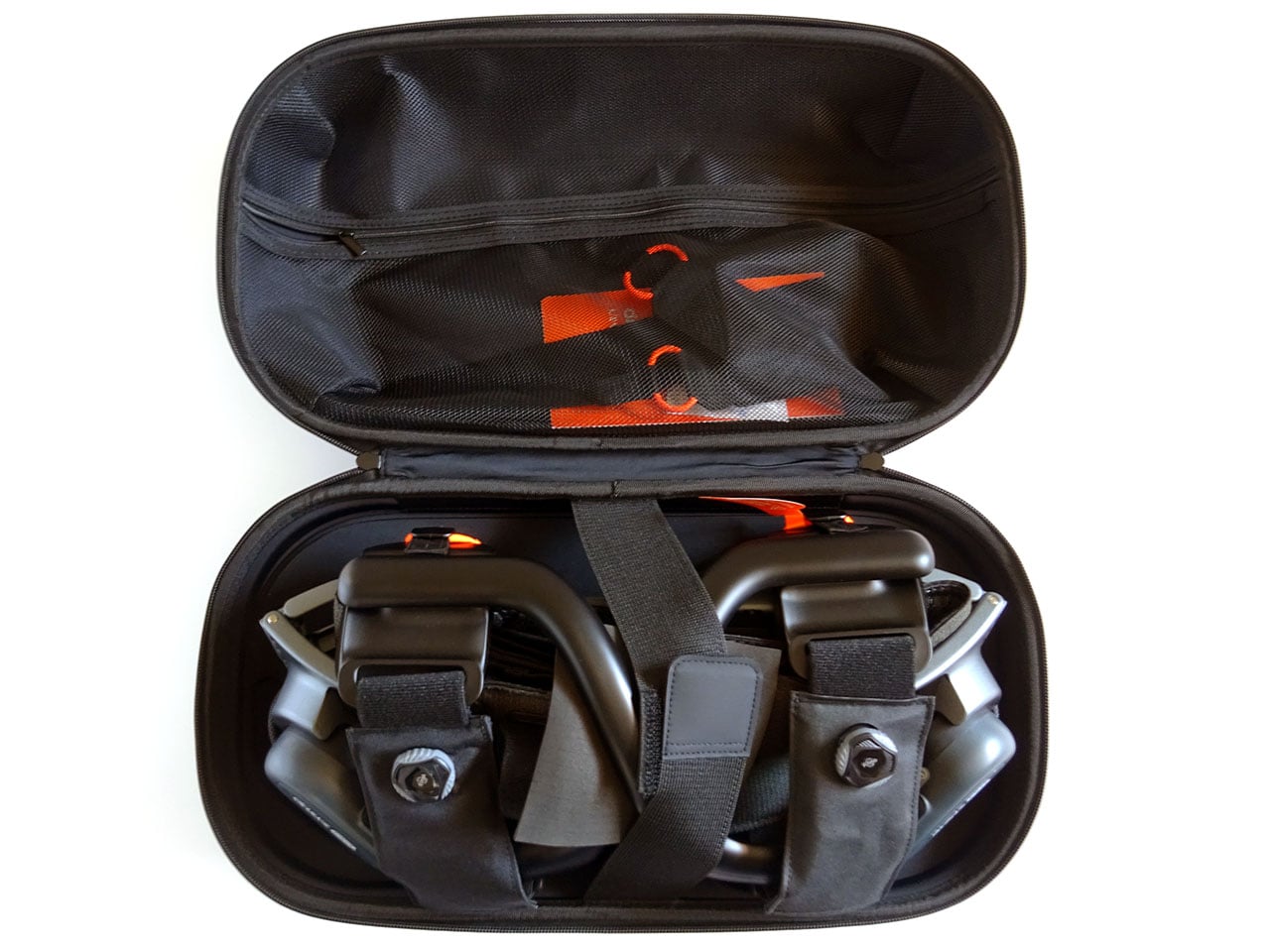L'exosquelette est livré dans une mallette rigide avec un manuel, un adaptateur de charge, un chargeur, un câble USB, un câble d'alimentation, deux batteries et deux jeux de sangles.