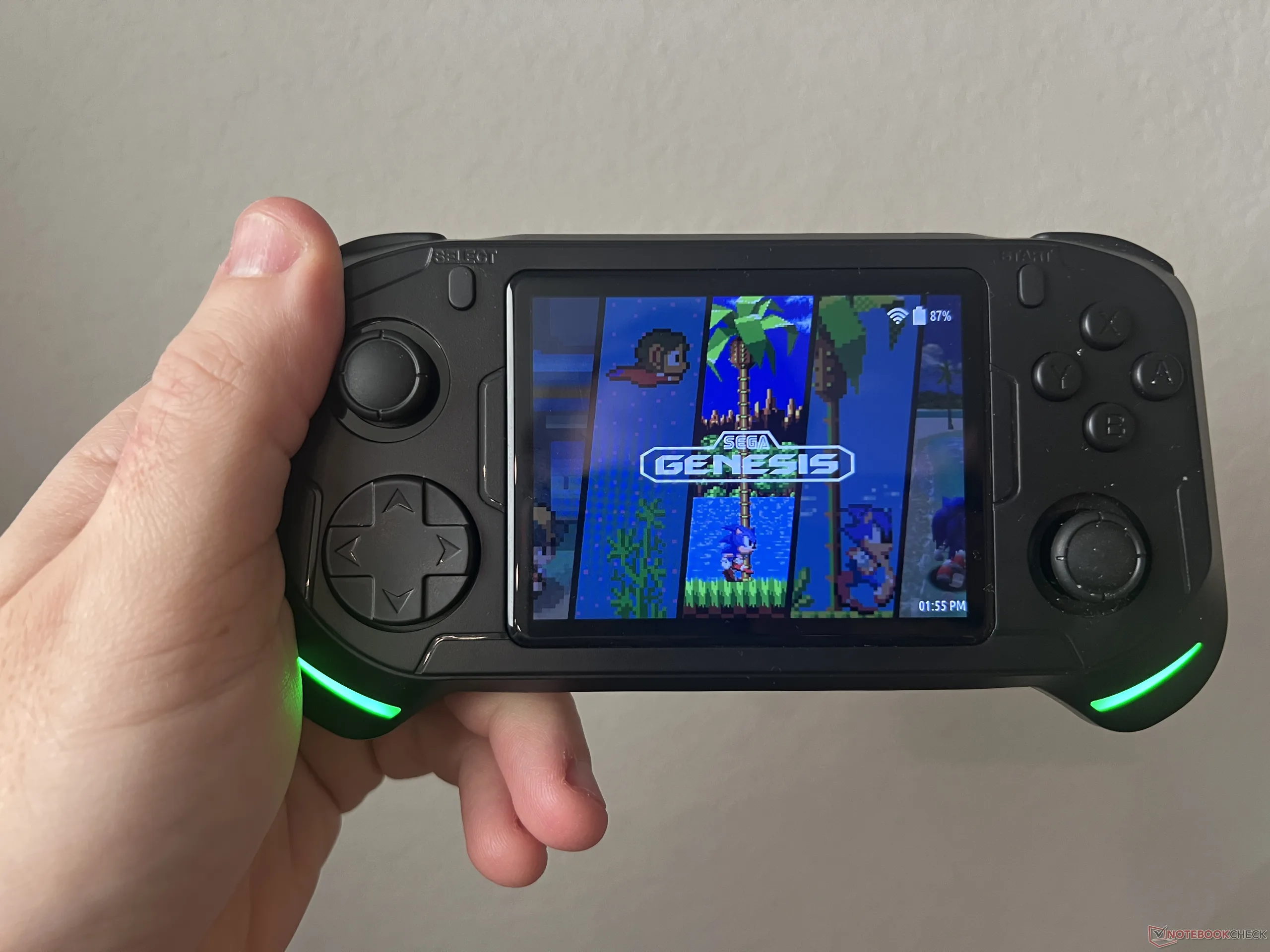 Deux bandes LED vertes se trouvent au bas de chaque poignée pour donner un peu d'allure à l'ensemble. La couleur ne peut pas être modifiée, mais il est possible de la régler pour qu'elle s'allume ou s'éteigne. Il y a deux haut-parleurs intégrés à l'arrière, ainsi que deux ports USB-C (un pour la charge, un pour connecter une manette) et une prise audio de 3,5 mm le long de la partie inférieure. La partie supérieure accueille un port mini-HDMI pour la connexion à un téléviseur.