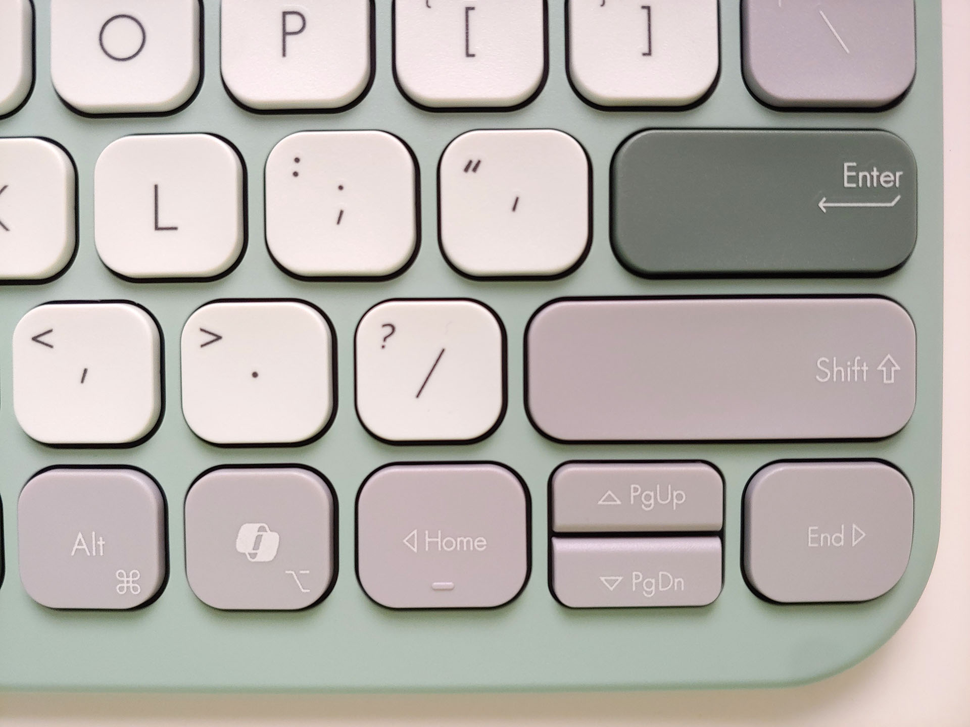 La variante Thé vert utilise des touches noires sur fond blanc très lisibles, et les touches F et J sont dotées d'alvéoles qui facilitent leur repérage. Les touches situées à l'extrême gauche et à l'extrême droite, telles que Tab, Shift, Fn, Alt, Ctrl, Delete et Backspace, sont moins lisibles en raison de l'utilisation d'un lettrage fin, blanc tendre, sur un fond gris clair ou foncé.