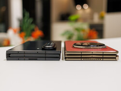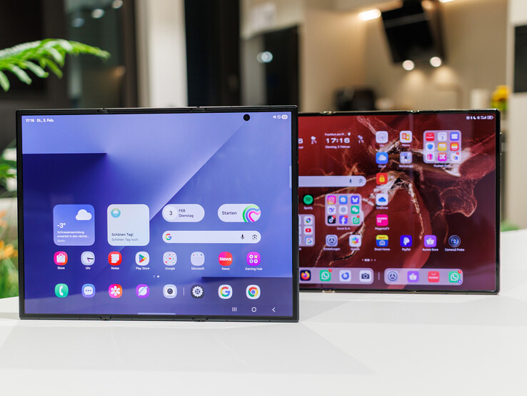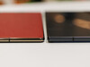 Huawei a inauguré un élégant mécanisme de pliage en Z avec le Mate XT (ici dans hands-on), qui peut passer en toute transparence d'une couverture de 6,4 pouces à un double écran de 7,9 pouces et à un plein écran de 10,2 pouces. D'une épaisseur minimale de 3,6 mm lorsqu'il est déplié, il est ultra-mince (élément le plus épais : 4,25 mm) et pèse 298 grammes. Samsung (hauteur : 3,9 / 4,2 / 4,0 mm), quant à lui, mise sur un design en U avec un écran de couverture séparé de 6,5 pouces et deux ailes latérales qui s'ouvrent sur un panneau Dynamic AMOLED 2X de 10 pouces ; le résultat est plus robuste (IP48), mais plus volumineux (12,9 mm plié, 309 g) et visuellement plus sobre avec des bords plus épais. Le dos en carbone est également très sensible aux traces de doigts. En contrepartie, la charnière du TriFold est plus serrée et donne donc une impression de plus grande stabilité. Il est toutefois dommage que Samsung ne vous permette pas d'utiliser seulement deux éléments d'écran. Les différences de hauteur et de poids sont à peine perceptibles dans une utilisation quotidienne.