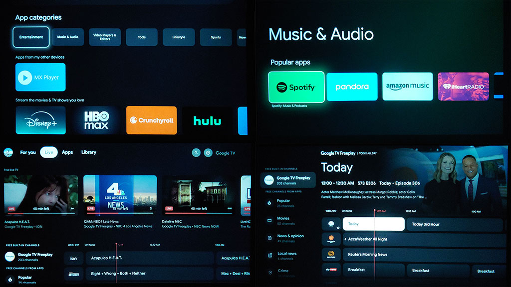 Le TCL C1 fonctionne sous Google TV OS et est livré avec la version 11 installée. Les principaux services de streaming, tels que Netflix et YouTube, ont fonctionné comme prévu, à l'instar d'autres appareils équipés de Google TV. Les propriétaires peuvent choisir de configurer le projecteur avec ou sans connexion, et la disposition de l'écran d'accueil varie en fonction de ce choix.
