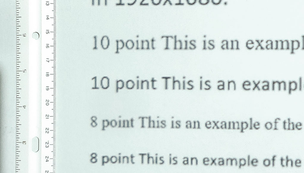 Lorsqu'il est connecté à un ordinateur, le texte à quatre points et plus est lisible, de sorte que le TCL C1 peut être utilisé comme écran PC externe. Les pixels deviennent visibles lorsque l'on s'approche de l'image projetée à 1 m (3,3 ft.) ou plus près, mais ne sont généralement pas perceptibles à des distances de visualisation normales. La pixellisation devient gênante avec des textes de taille inférieure à six points. Les rampes de gris ne sont pas parfaitement lisses, mais les bandes de couleur visibles sont généralement limitées aux ombres sombres et aux aplats de couleur.