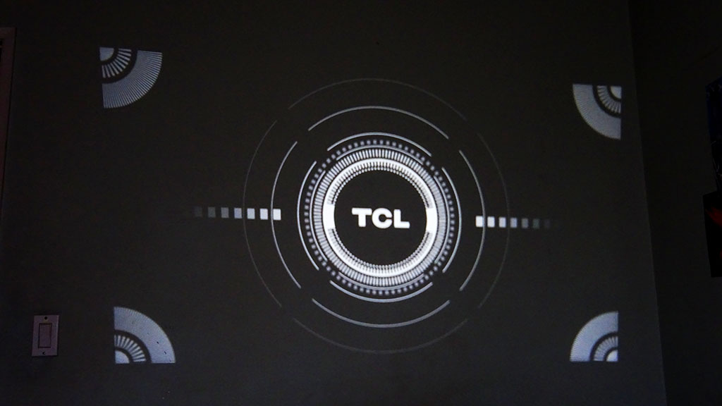 Pendant la configuration de l'image, qui prend environ quinze secondes, l'appareil projette d'abord un logo TCL blanc sur noir avec des lignes rayonnantes tout en utilisant une caméra de mise au point automatique pour définir la mise au point. Ensuite, l'appareil projette une grille de carrés noirs et bleus sur fond blanc pour ajuster la distorsion trapézoïdale en quelques secondes. Des options de réglage manuel sont disponibles.