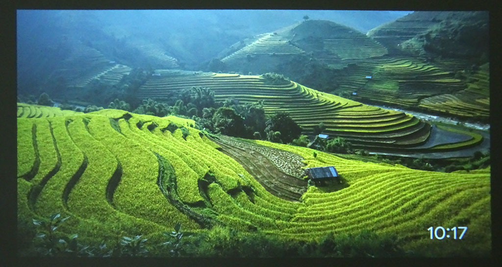La luminosité de 230 lumens ISO du projecteur avec un écran de 65 pouces produit une image satisfaisante en mode d'image standard, avec des performances solides dans les scènes très lumineuses et très sombres. La netteté est bonne et les détails tels que la barbe d'un homme ne sont pas trop accentués. L'homogénéité du rétroéclairage LED est très bonne et la légère baisse de luminosité dans les coins n'est pas visible dans des conditions normales d'utilisation.