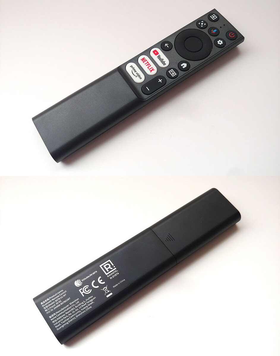 La télécommande fournie est en plastique, avec un design à deux niveaux qui place les boutons de volume à un niveau plus élevé que les boutons principaux. Tous les boutons ont une course courte et une réponse nette, avec une bonne lisibilité à bout de bras. Les boutons ne sont ni rétroéclairés ni phosphorescents. Le dos de la télécommande est légèrement texturé pour une meilleure prise en main, ce qui facilite le retrait du couvercle pour remplacer les deux piles AAA. Le récepteur IR est situé à côté des ports arrière, mais la télécommande est suffisamment puissante pour qu'il ne soit pas nécessaire de la pointer directement vers le TCL C1 pour le contrôler.