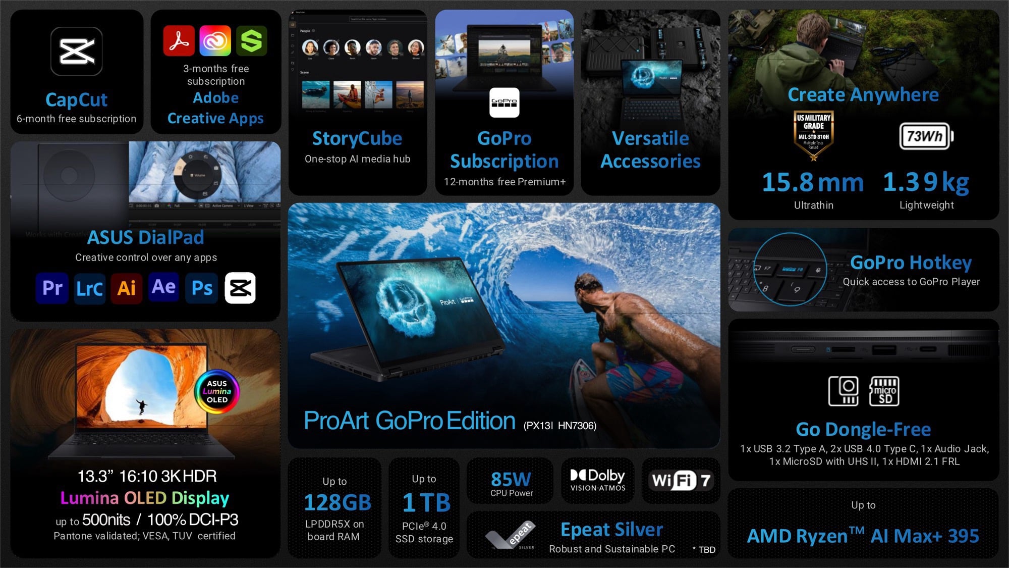 Néanmoins, le poids du ProArt PX13 reste inchangé à 1,38 kg. De plus, Asus continue d'installer une batterie de 73 Wh, mais avec la prise en charge de la charge USB Type-C de 130 W. L'écran OLED de 13,3 pouces et 2,8K fait également son retour, même s'il reste plafonné à 60 Hz et 400 nits. Pendant ce temps, la GoPro Edition tire parti d'un extérieur plus robuste avec un raccourci clavier pour ouvrir une application GoPro Player préinstallée associée à 12 mois d'abonnement Premium Plus de GoPro.