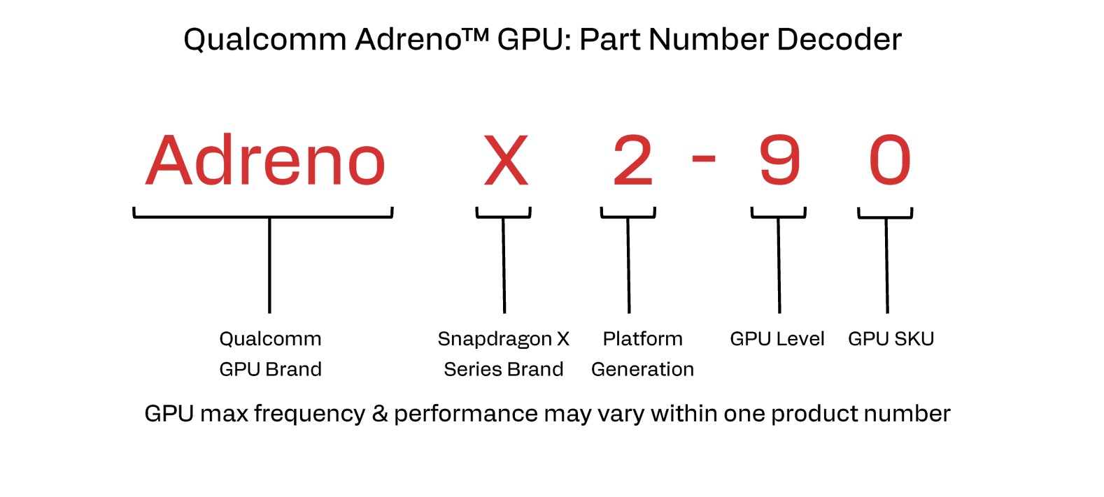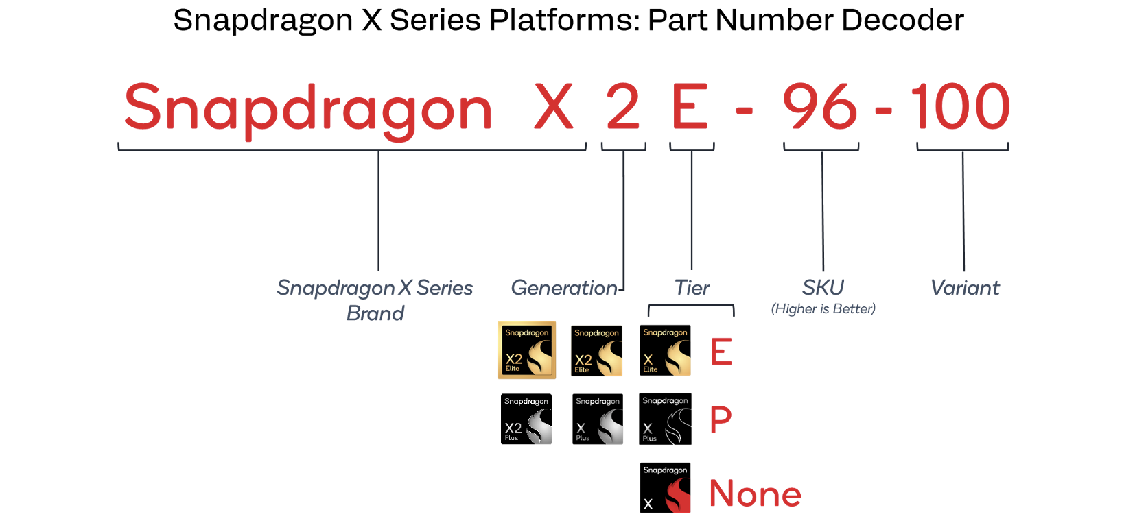 La nouvelle génération de Snapdragon X2 commence par les versions les plus puissantes et, outre les puces Snapdragon X2 Elite, nous avons également des processeurs X2 Elite Extreme. La nomenclature était déjà assez confuse pour la première génération et ce n'est pas plus facile maintenant. Les deux images suivantes montrent la nomenclature du processeur et de la carte graphique ainsi que leur signification.