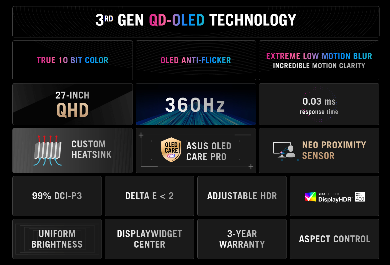 Aujourd'hui, Asus a listé le ROG Strix OLED XG27AQDNG, qui porte le même nom, sur son site web mondial, avec des spécifications matérielles complètes et des images de l'appareil. Malgré son nom, le ROG Strix OLED XG27AQDNG suit en fait le modèle 27 pouces ROG Strix OLED XG27ACDNG qui a fait ses débuts il y a plus d'un an (actuellement 729,99 $ sur Amazon). Comme le montre clairement le graphique ci-dessous, le ROG Strix OLED XG27AQDNG conserve le QD-OLED de 27 pouces et de 3ème génération du XG27ACDNG avec une résolution native de 1440p et un taux de rafraîchissement de 360 Hz.