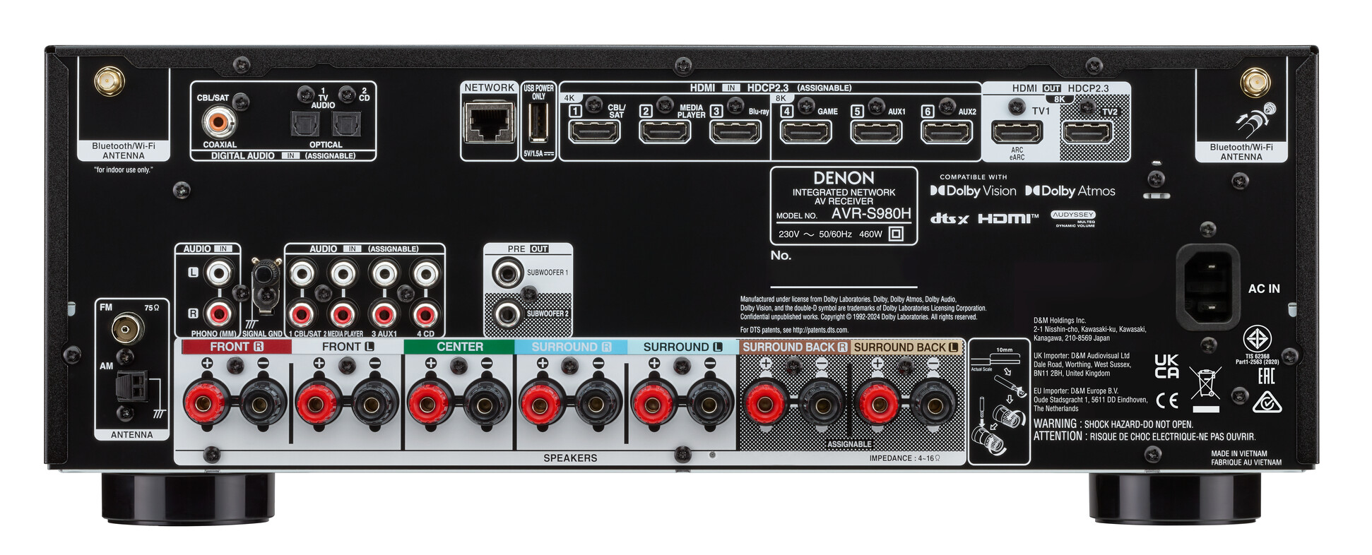 Denon promet une installation facile en quelques étapes pour l'AVR-S980H, dans le but d'apporter le son du home cinéma dans le salon sans complication. L'ampli-tuner AV dispose à cet effet de 7,2 canaux ; lorsqu'il est utilisé avec Dolby Atmos, il peut par exemple être exploité dans une configuration à 5,2,2 canaux avec deux subwoofers et deux haut-parleurs de plafond. L'amplificateur fournit 90 watts par canal, ce qui devrait représenter une puissance suffisante pour les home cinémas de salon.