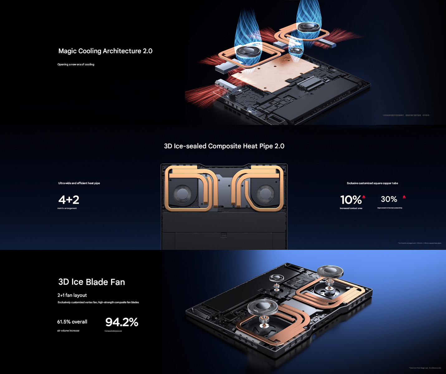 Il existe une autre option avec la RTX 5080, un GPU haut de gamme pour ordinateur portable. RedMagic souligne que le CPU et le GPU sont associés à l'architecture de refroidissement Magic Cooling Architecture 2.0, qui est censée maintenir le système au frais pendant les charges lourdes. Le design est censé permettre un flux d'air plus important que le prédécesseur, et il y a un total de trois ventilateurs actifs.