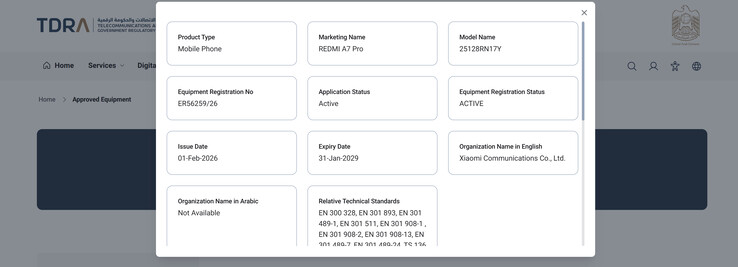 Comme le montre la capture d'écran ci-dessous, Xiaomi a certifié le Redmi A7 Pro auprès de l'Autorité de régulation des télécommunications et du gouvernement numérique (TDRA). Organisme de réglementation des Émirats arabes unis, la TDRA associe le nom "Redmi A7 Pro" au numéro de modèle 25128RN17Y, dont 25128RN17 est la racine. Malheureusement, la TDRA ne donne pas plus de détails sur les spécifications matérielles.