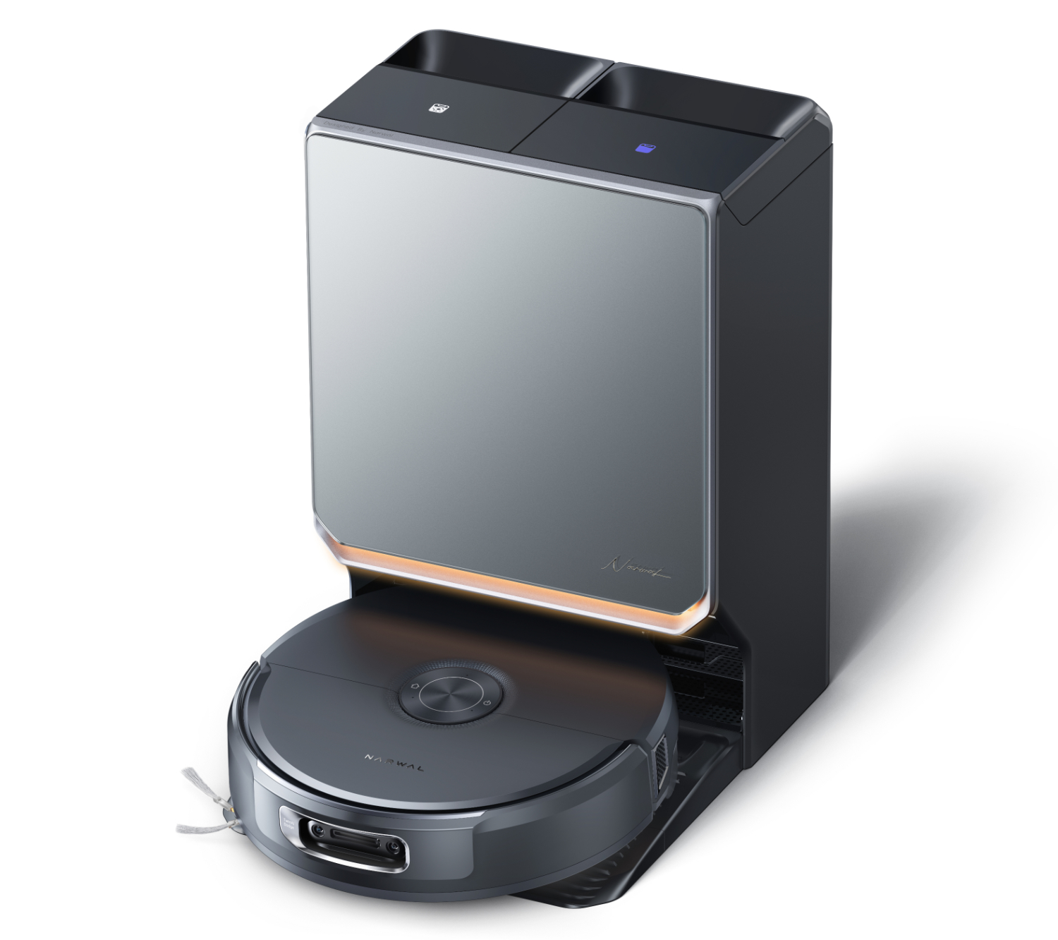 En outre, le Flow 2 peut à nouveau franchir des obstacles jusqu'à 40 mm et reste relativement mince à 95 mm - en partie en raison de l'absence d'une tourelle Lidar traditionnelle. Le nouveau Narwal Flow 2 est livré avec la station de base habituelle, qui présente un nouveau design et, entre autres, reconditionne complètement l'unité de lavage, distribue la solution de nettoyage et effectue un auto-nettoyage.