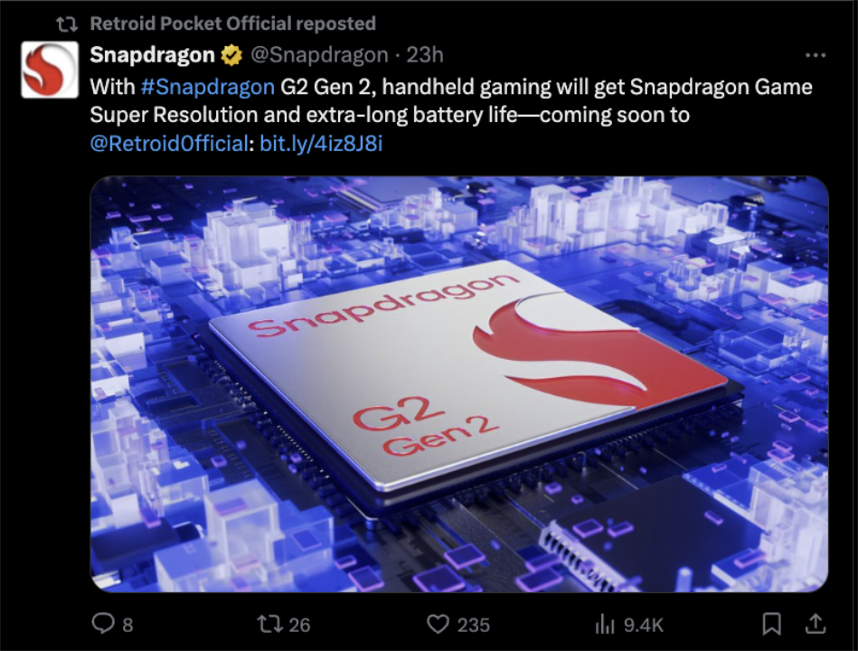 Pour l'instant, Retroid se contente de suggérer qu'elle présentera quelque chose de futuriste dans le courant du mois. Plus précisément, la société a confirmé qu'elle donnerait plus de détails le 27 octobre. Entre-temps, Qualcomm a peut-être déjà laissé entendre que la prochaine console de jeu de Retroid utilisera le Snapdragon G2 Gen 2, un chipset qui a été présenté en mars aux côtés de deux autres chipsets dédiés aux jeux.