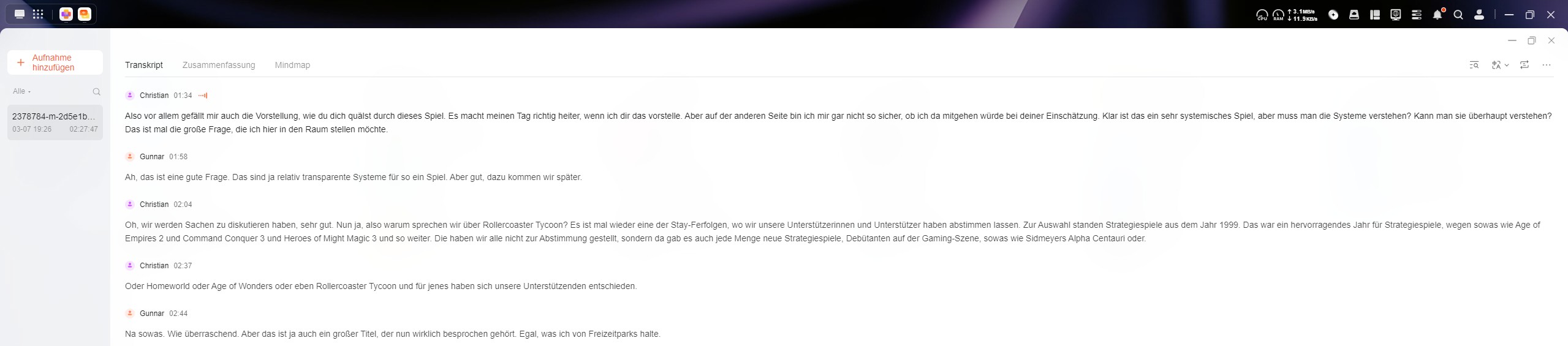 Une application permet de transcrire et de résumer des fichiers audio. Nous avons évalué cette fonction en détail en utilisant épisode 161 du podcast Stay Forever. L'épisode du podcast dure un peu moins de 2 heures et 30 minutes, et la transcription a pris 10 minutes. La transcription est très utilisable. Les monologues plus longs sont parfois divisés en deux entrées distinctes, mais cela est tout à fait inoffensif. Il y a des écarts mineurs ; par exemple, une phrase a été reconnue incorrectement au lieu de la formulation correcte. La reconnaissance du locuteur fonctionne de manière fiable, et les noms des locuteurs ainsi que la transcription elle-même peuvent être édités. Un clic sur le texte pertinent permet de lire la section correspondante. Dans l'ensemble, l'expérience utilisateur est très bonne. La transcription peut être exportée sous la forme d'un document DOCX formaté. Un résumé peut également être généré, et même une carte mentale peut être créée.